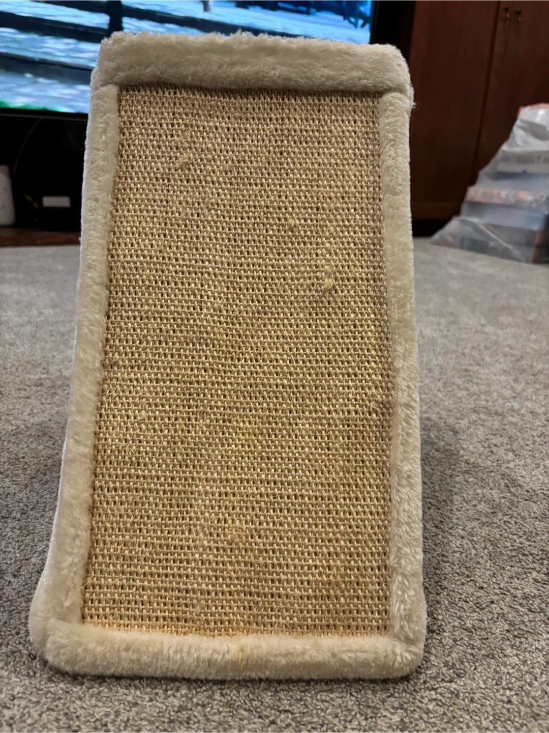 This triangular cat tent is made of soft, furry material and includes a sisal scratch pad. It's perfect for cats to play and rest in! Comes with a dangling pom-pom toy inside for extra fun.