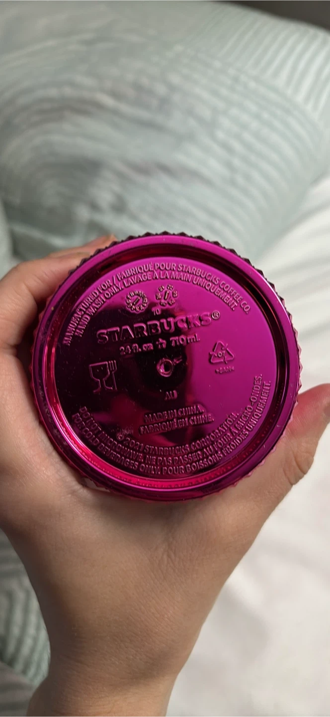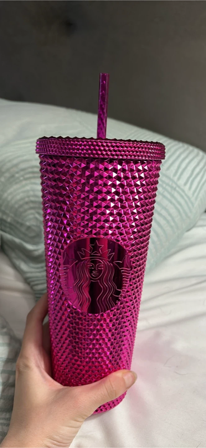 This is a sparkly pink studded Starbucks tumbler with a straw. It's a grande or venti size. Great for your daily beverages!