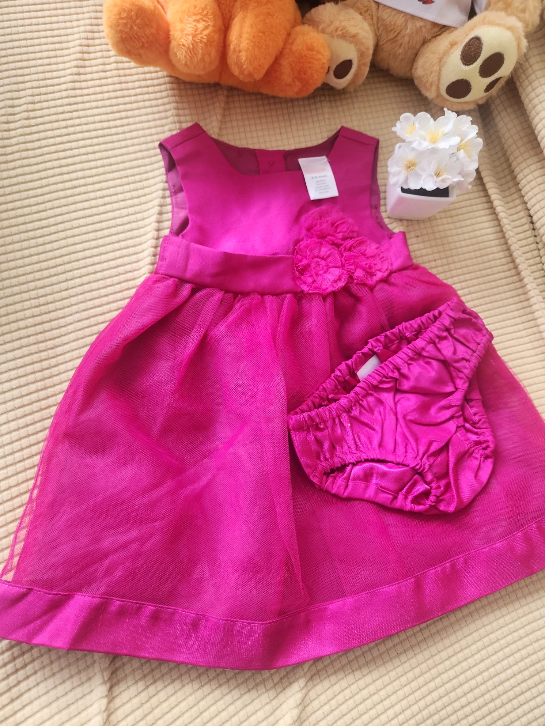 This adorable pink dress and matching bloomers set is perfect for your little one. The dress features a satin bodice with a tulle overlay skirt and a floral accent. It's a size 3-6 months.