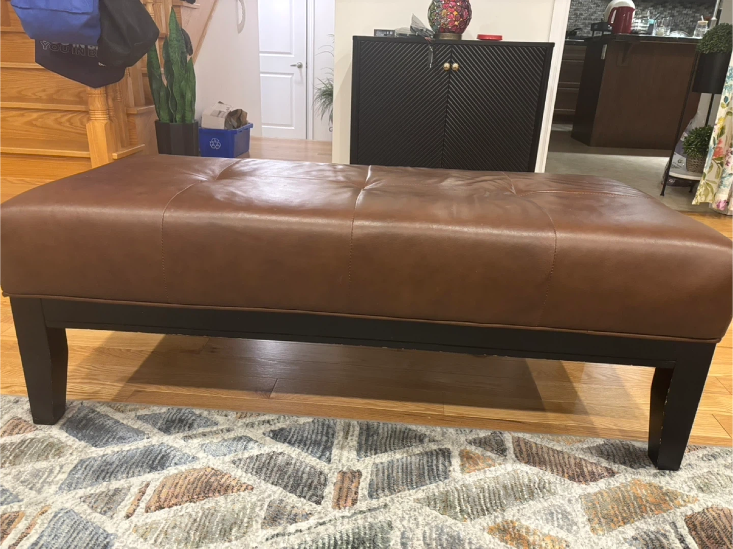 This is a brown tufted ottoman bench. It has a tufted top and a dark wood frame with dark wood legs. Its storage functionality makes it handy for keeping living spaces tidy.