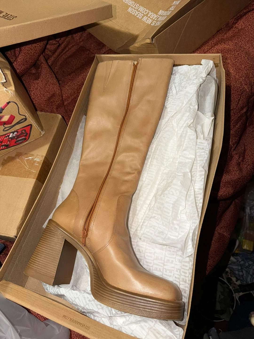 These Steve Madden knee-high boots are a chic tan color. They feature a side zipper and a chunky platform heel. Boots come in original box.
