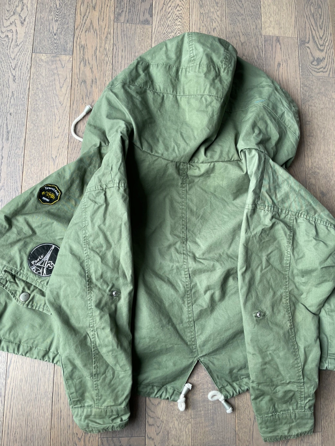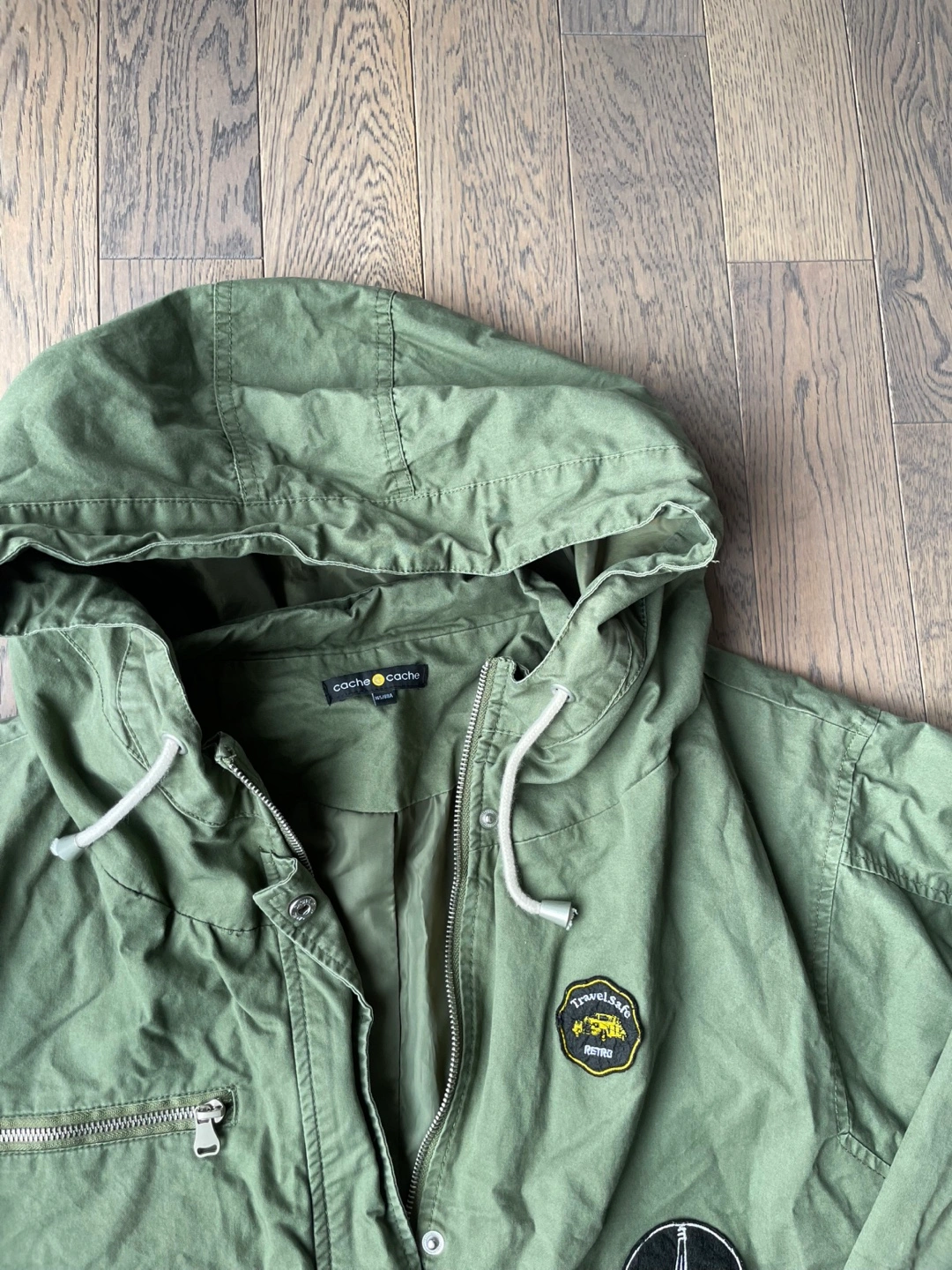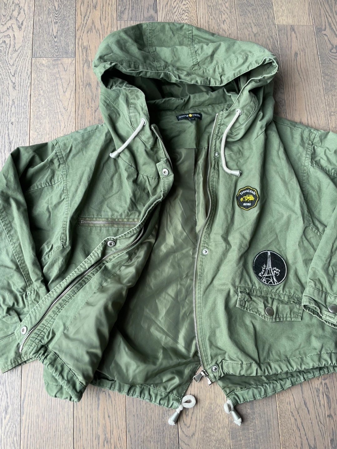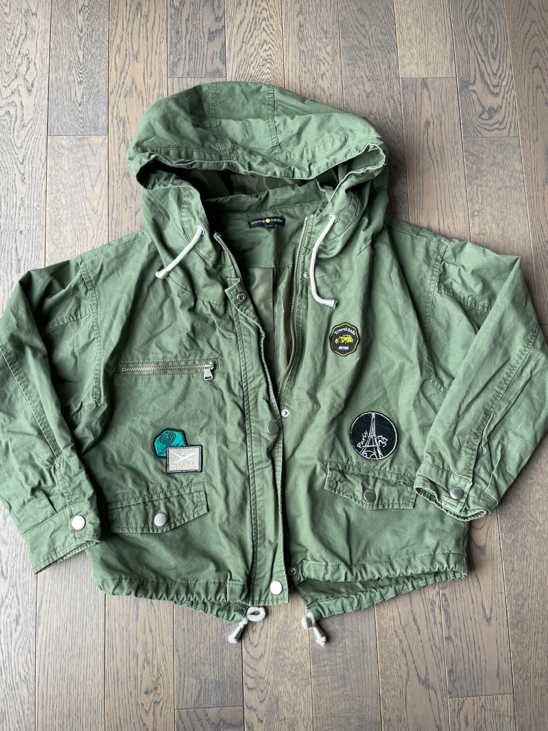 Green anorak jacket by Cache Cache. It features multiple patches including a cityscape and travel motifs. Drawstrings at the hood and hem.