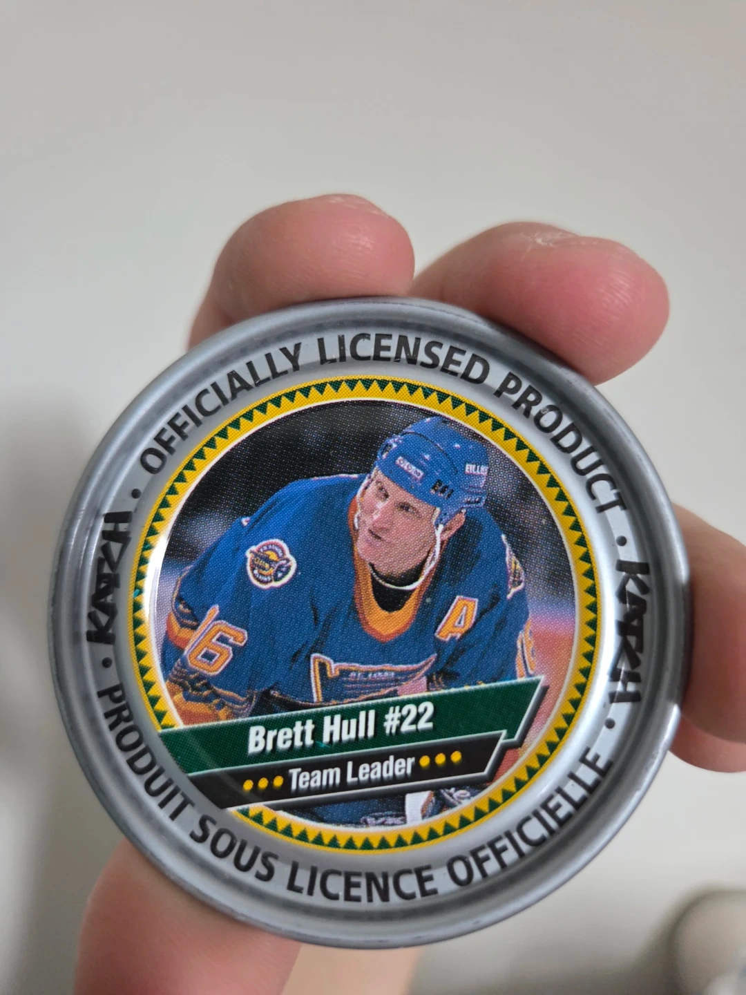 Collectible hockey puck featuring Brett Hull, a Dallas Stars Team Leader. This is an officially licensed product from KATCH. The puck is in great condition and ready for display.