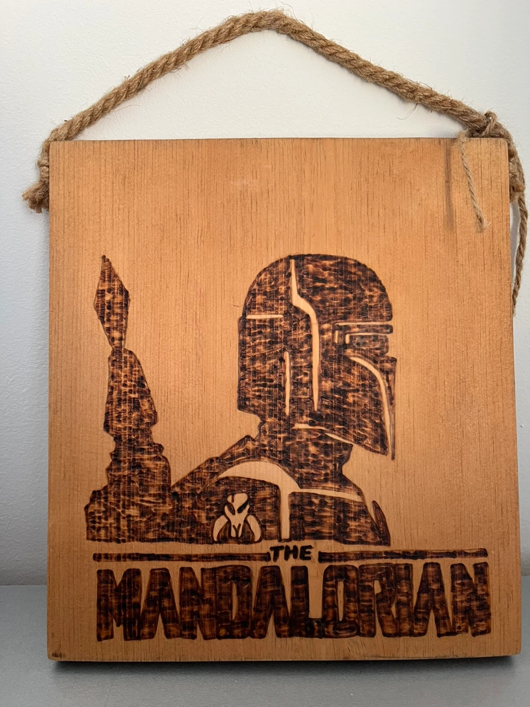 This is a wood-burned art piece featuring 'The Mandalorian'. It's ready to hang with a rope. A unique piece for any Star Wars fan!