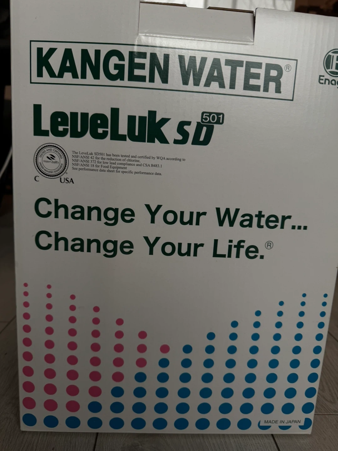 This is a pre-owned Enagic Kangen Water SD-501. It's a life science water apparatus made in Japan. It's been tested and certified by WQA according to NSF/ANSI 42 and CSA B483.1 standards.