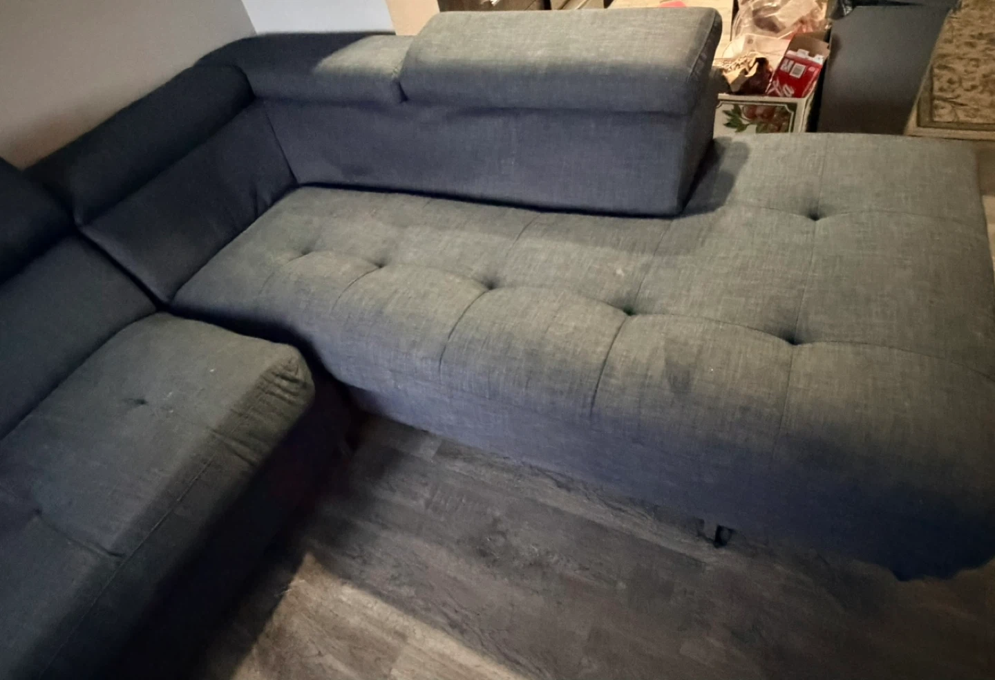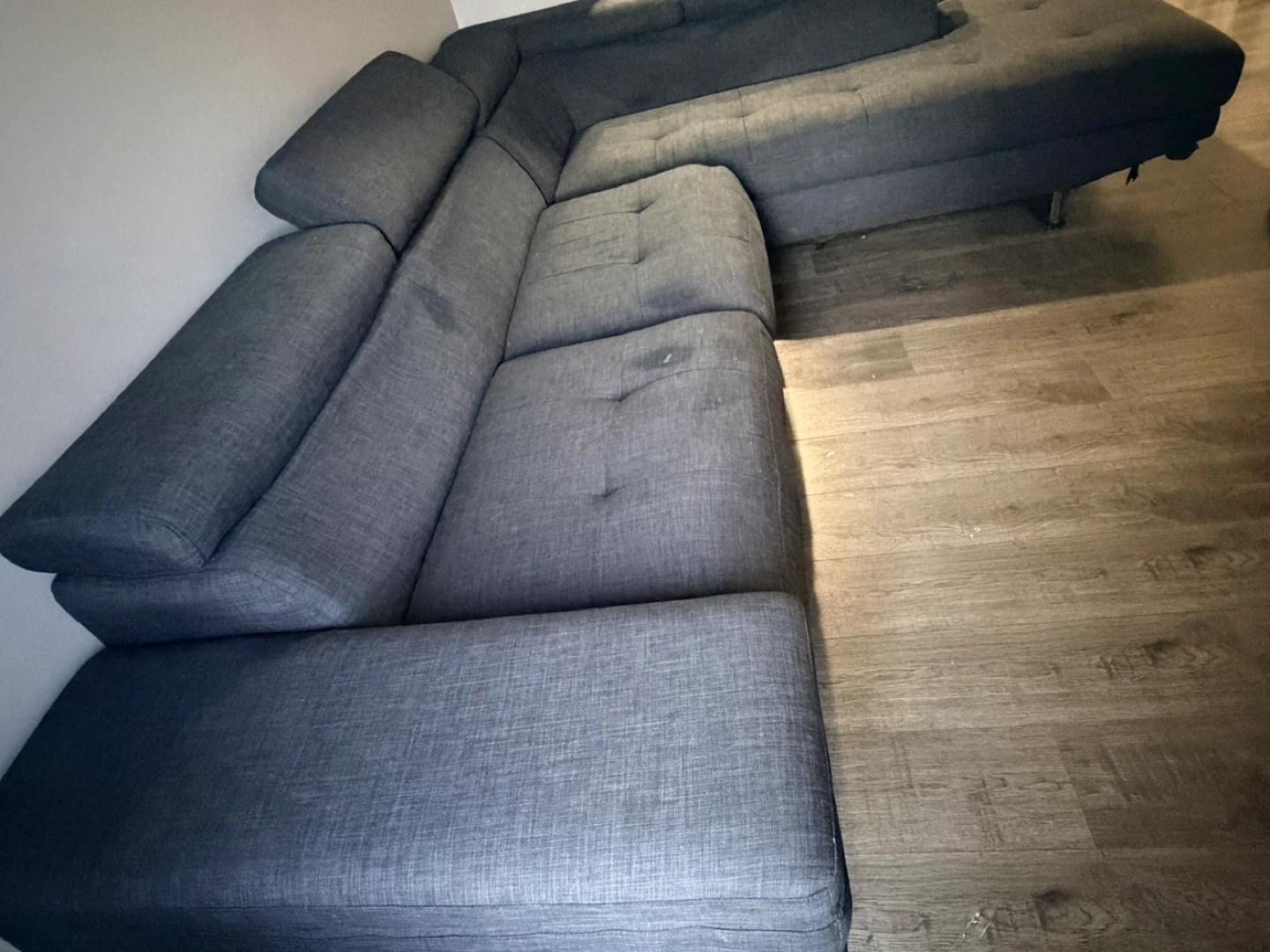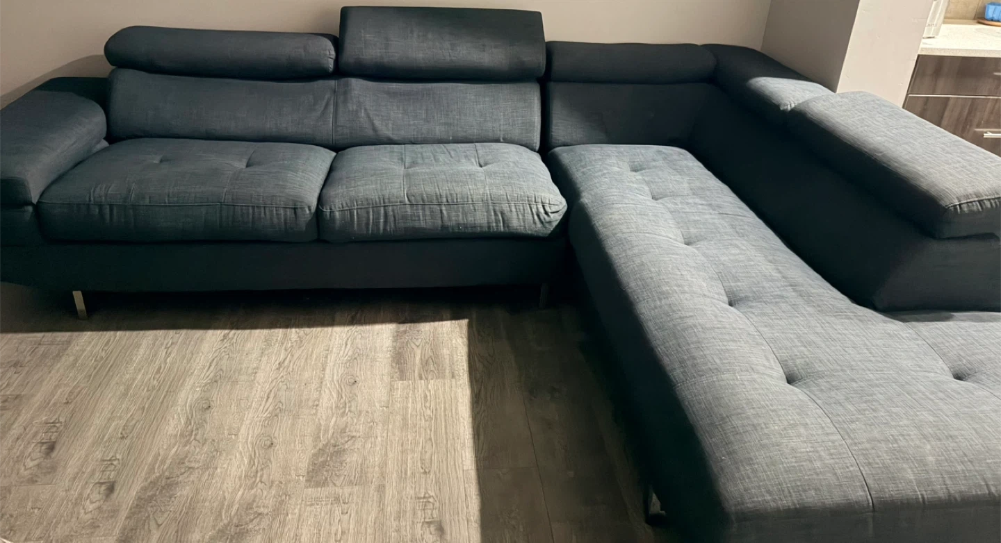 It's a dark grey sectional sofa. Features adjustable headrests for added comfort. Upholstered in a textured fabric. Provides ample seating for a living room. Very comfortable and neat.delivery available.