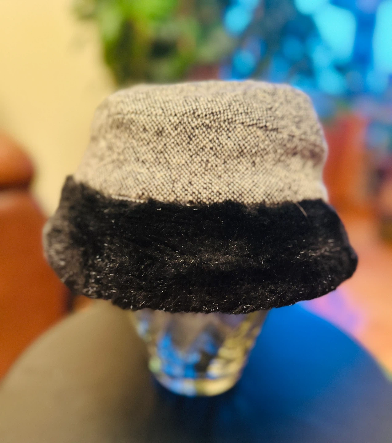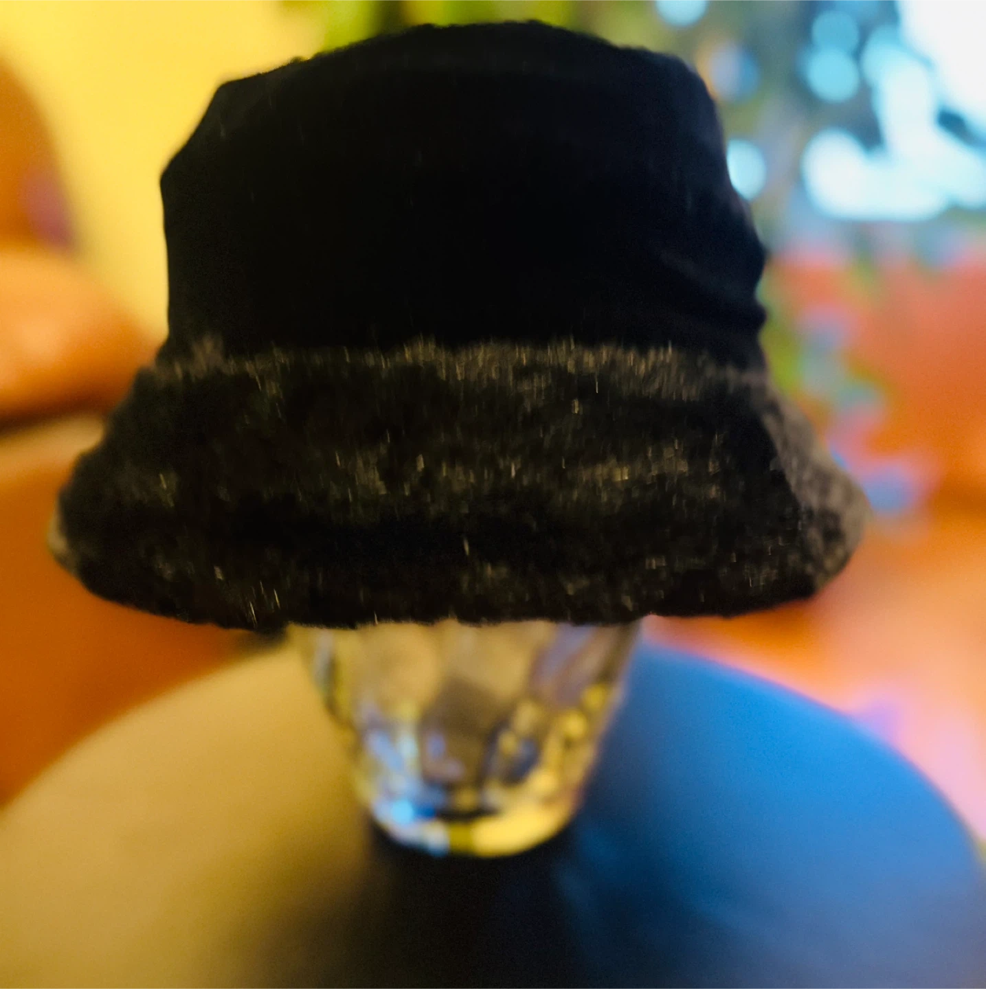 This black bucket hat features a soft velvet crown with a plush faux fur trim. It's a stylish accessory for cooler weather. Material is velvet and faux fur.