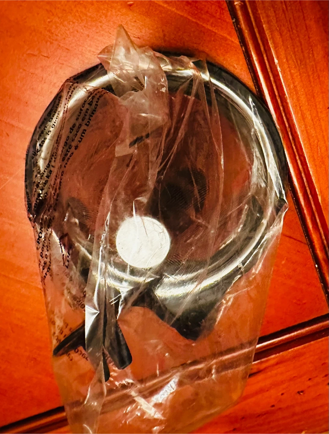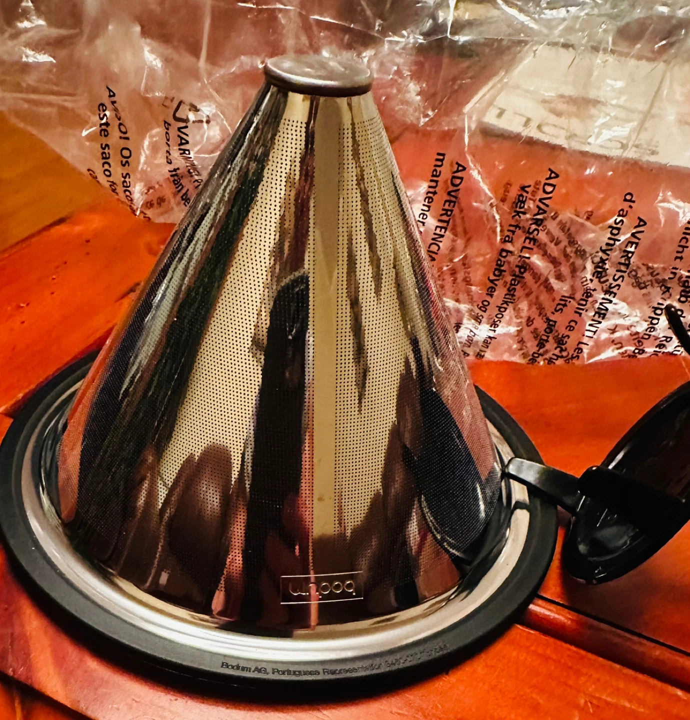 This is a Bodum stainless steel pour-over coffee filter cone. It's designed for brewing single cups of coffee. The cone features a fine mesh filter and a silicone base. It comes with a separate black handle piece.