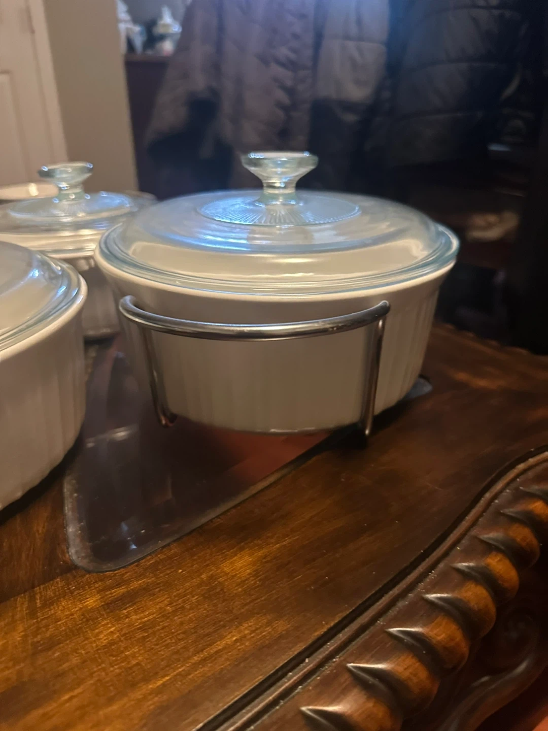 This is a set of Pyrex casserole dishes with glass lids. It includes various sizes for different cooking needs. The dishes are made of glass and come with wire racks.