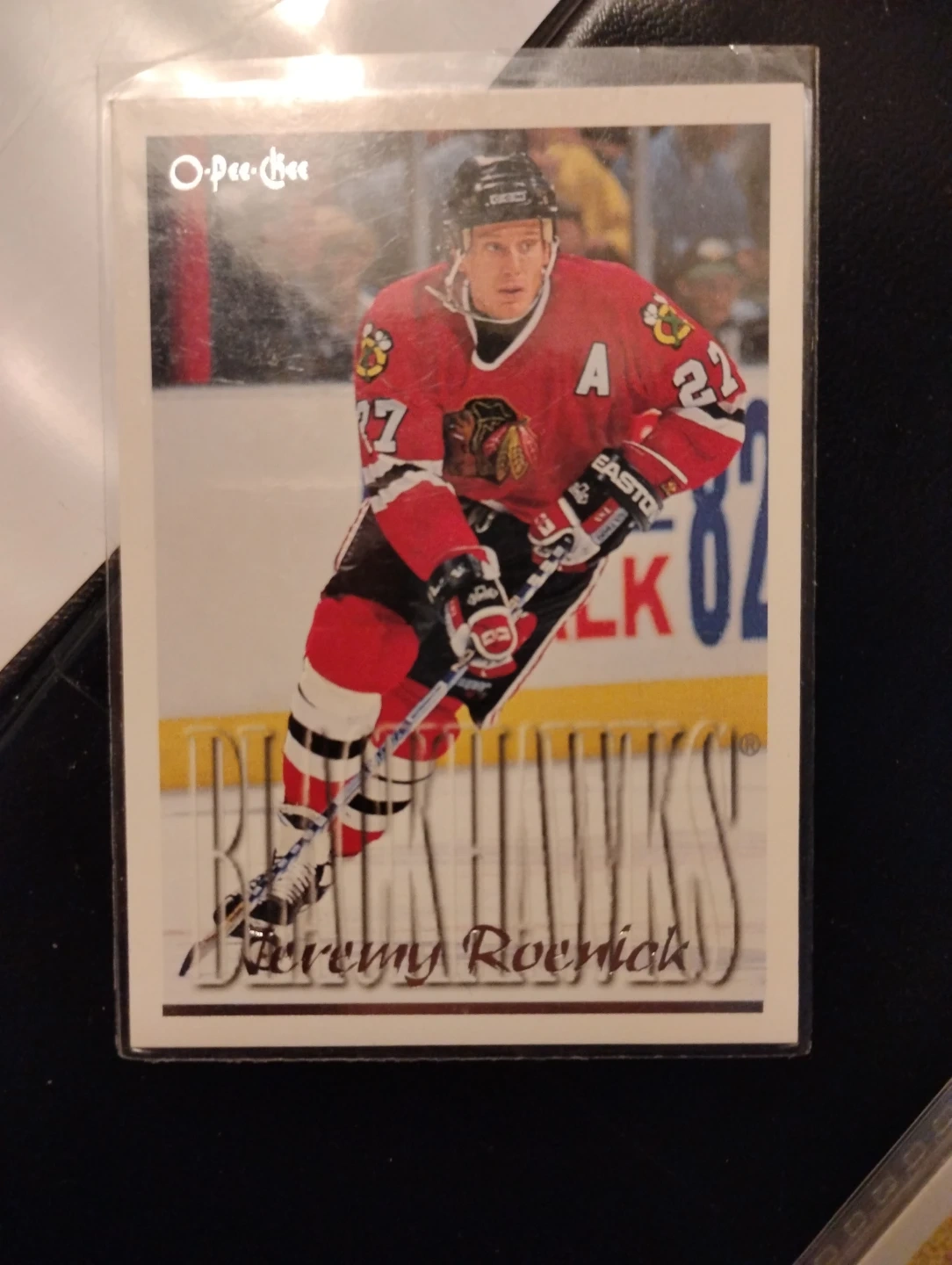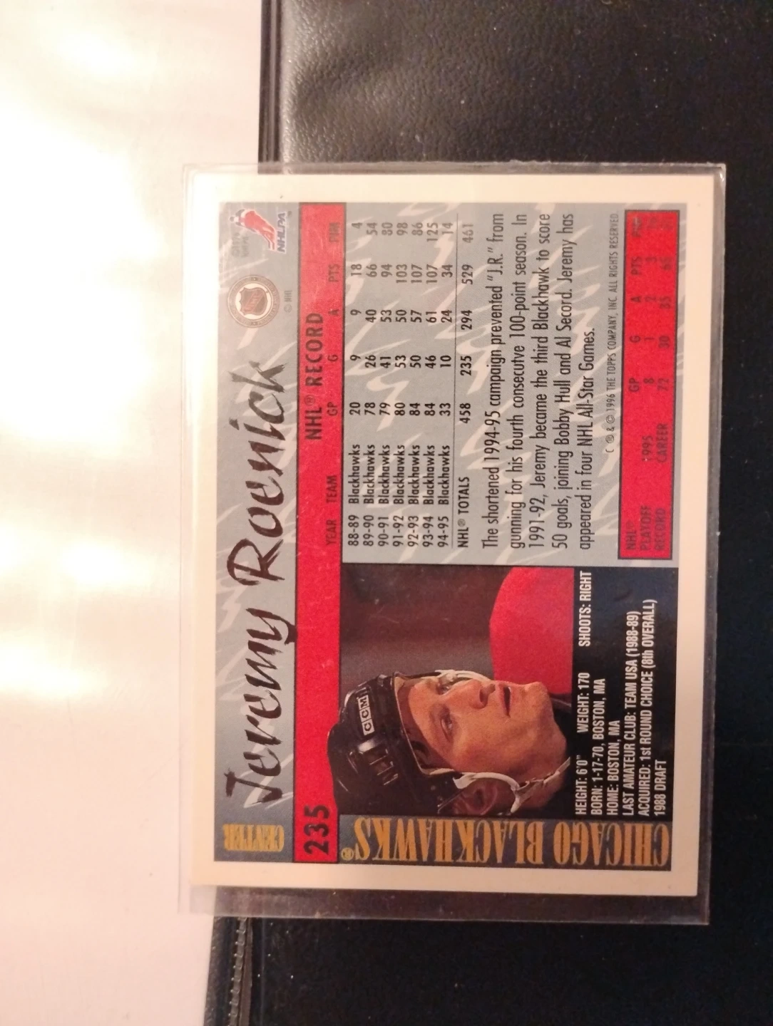 This is a 1995-96 O-Pee-Chee hockey card featuring Jeremy Roenick. It's card number 235. The back shows his NHL record and stats from his career with the Chicago Blackhawks. Mint Condition never been removed from its sleeve!