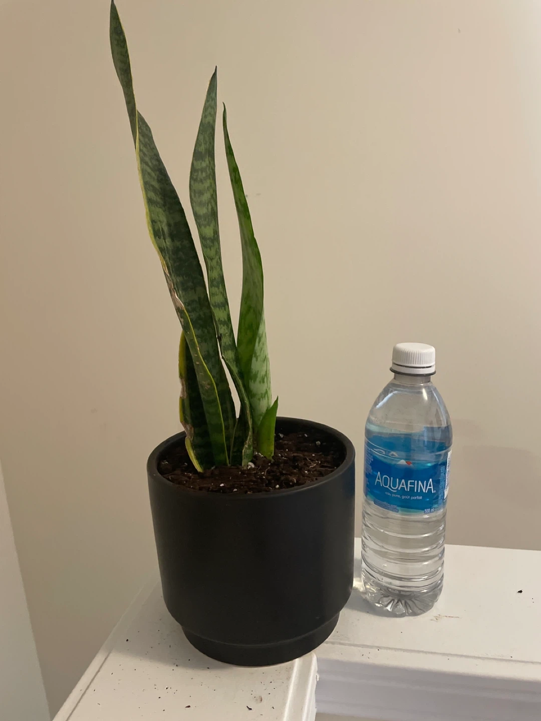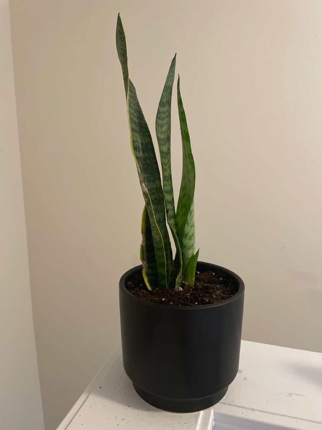 This is a healthy snake plant in a black pot. It's easy to care for and adds a nice touch to any room. This plant is known for its air-purifying qualities.