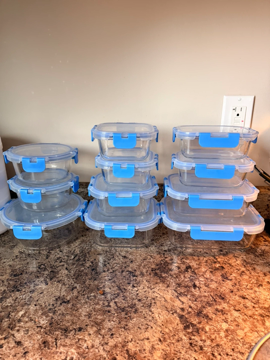 Set of 22 pieces glass food storage containers. Includes various round and rectangular sizes with airtight blue locking lids. Made from durable borosilicate glass. Great for meal prep, leftovers, and lunches!