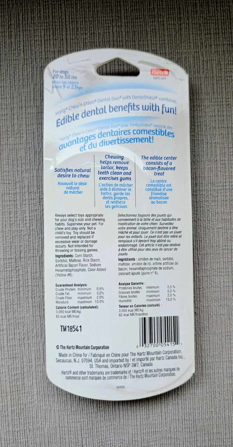This Hartz Chew 'n Clean Dental Duo chew toy is designed for dogs 20 to 50 lbs. It features DentaShield and an edible center. It's made with artificial bacon flavour.