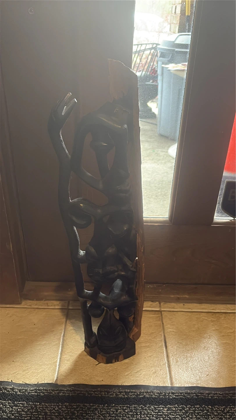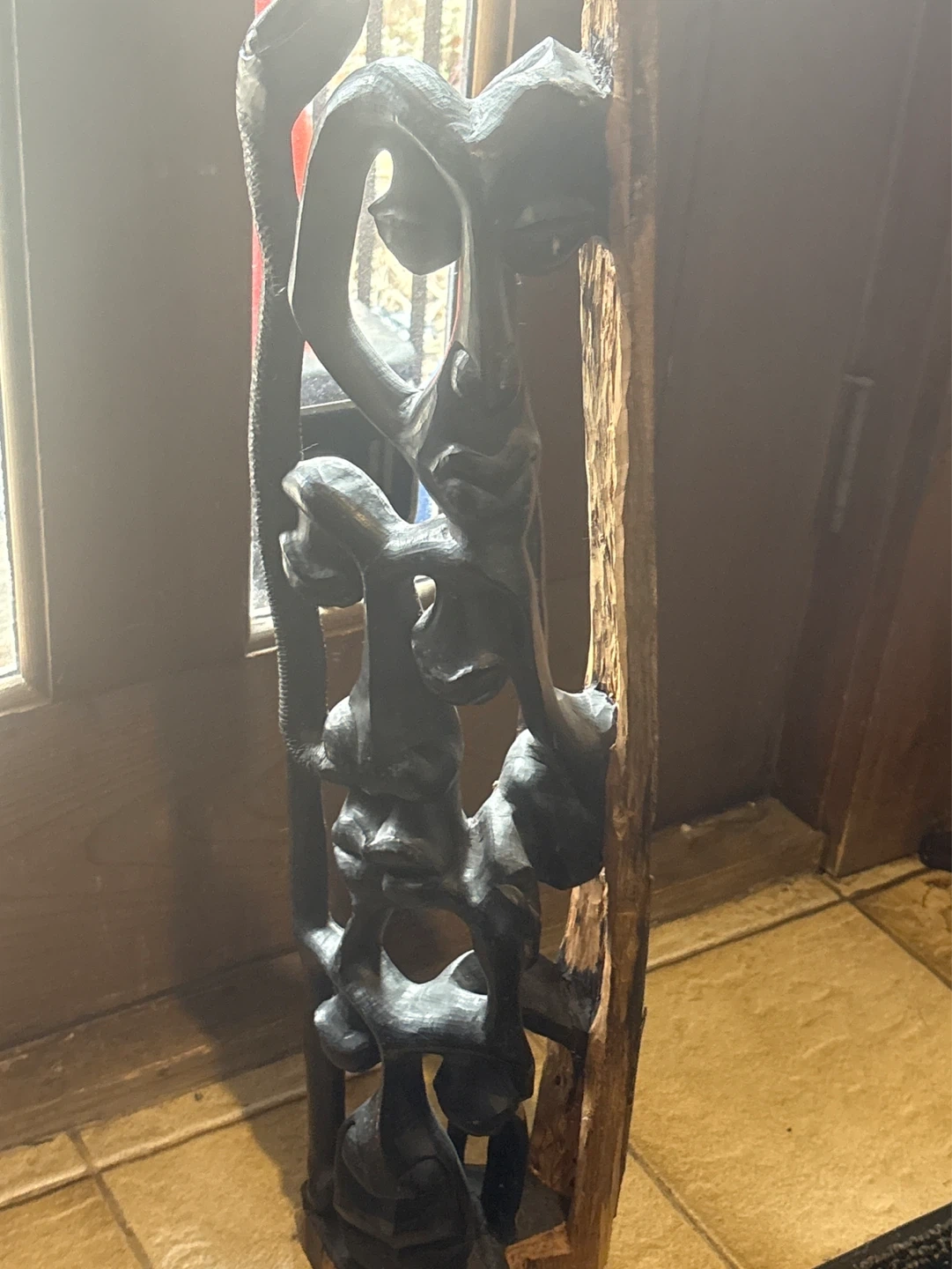 This is a unique, hand-carved wooden sculpture featuring intertwined figures and a natural wood edge. It's a striking piece for home decor. It would look great as a statement piece in a living room or entryway.