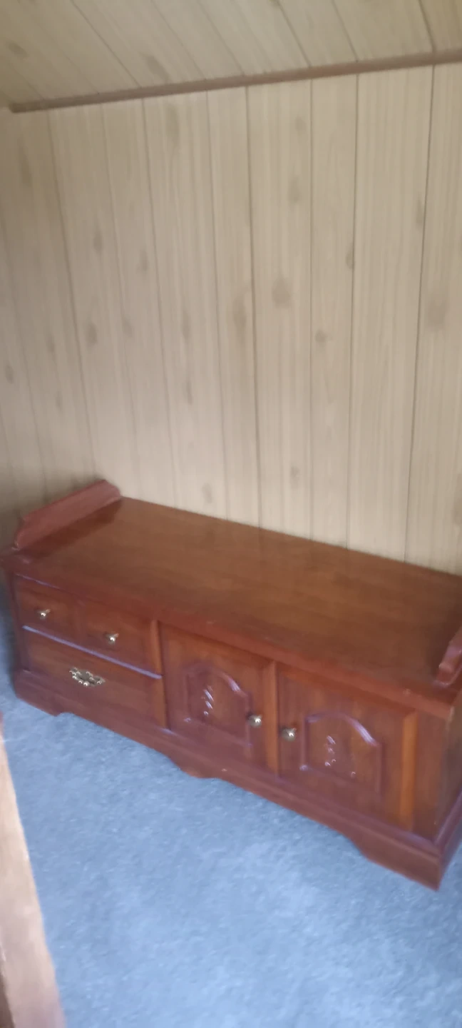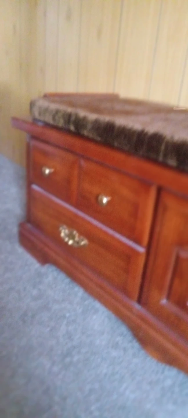 This wooden storage hope chest bench offers a comfortable upholstered top for seating,doors with decorative carving and brass knobs, plus with Ample storage space inside cedar lined to protect blankets and cloths