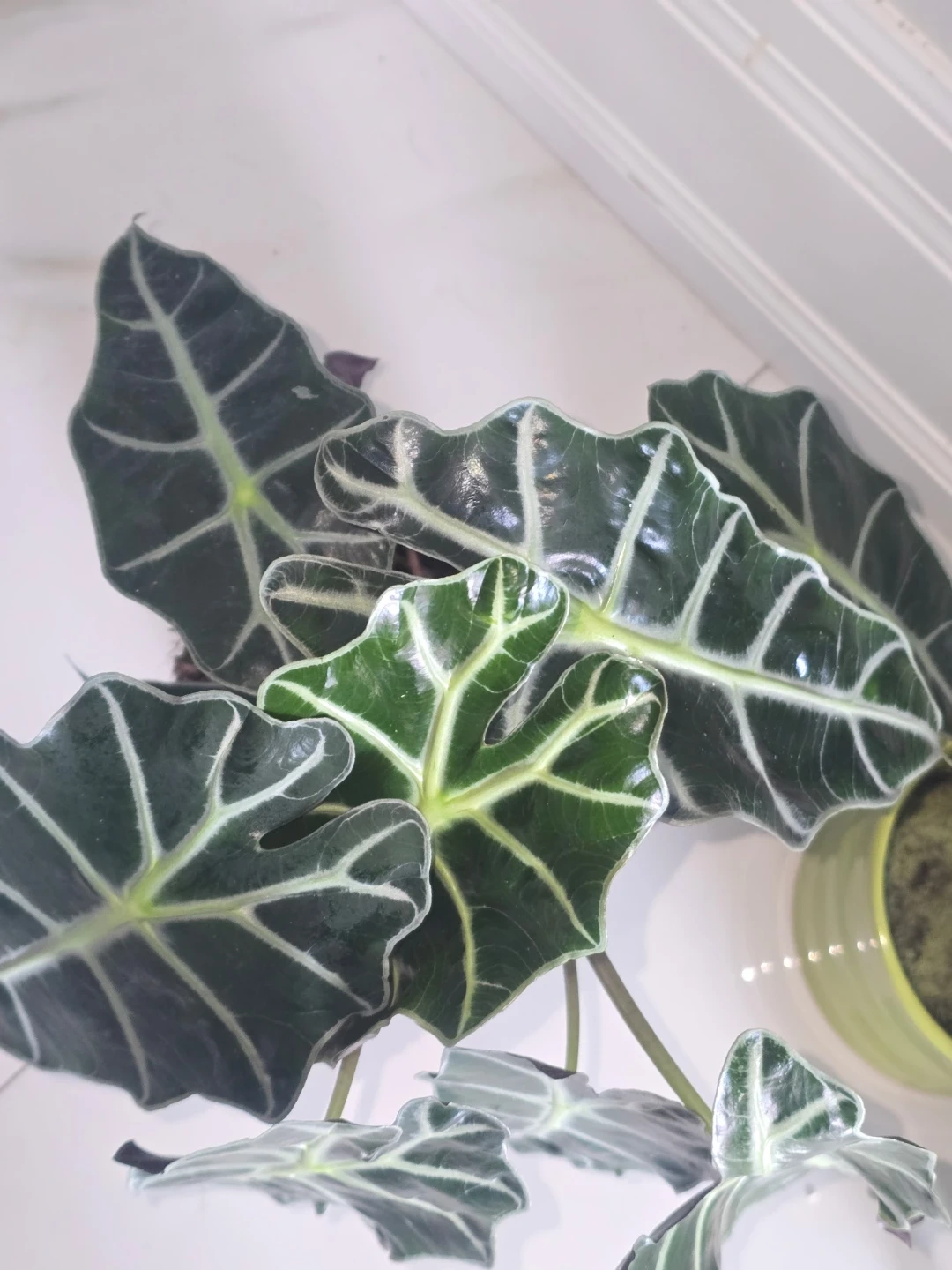 This is an Alocasia Polly, also known as an African Mask plant. It has striking dark green leaves with prominent white veins. Its unique leaf shape and pattern add a bold statement to any indoor space.