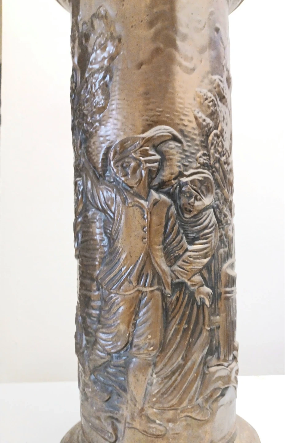 Vintage,Solid Construction English Embossed Brass Umbrella Stand or Cane Holder, featuring Traditional Scenes. Perfect for adding a touch of old-world charm to your entryway; it's in very good condition.