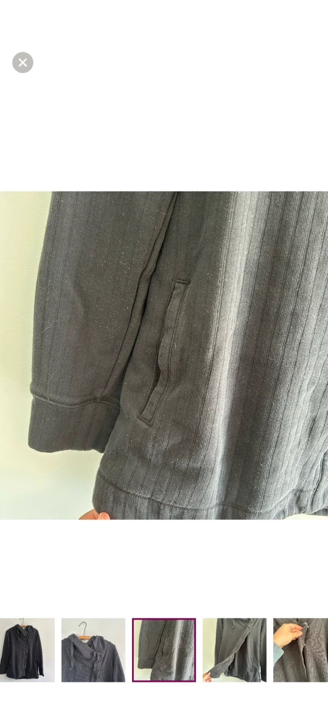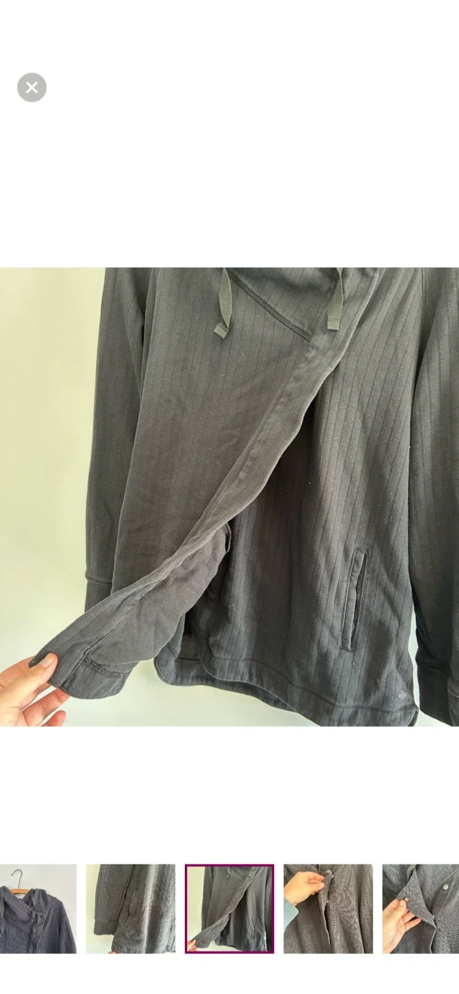 Shambhala brand. Long sleeve cowl neck cardigan with side wrap style button closure. Black In colour. Size large. Like new condition, light pilling.