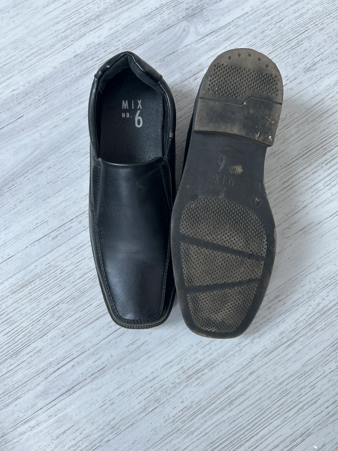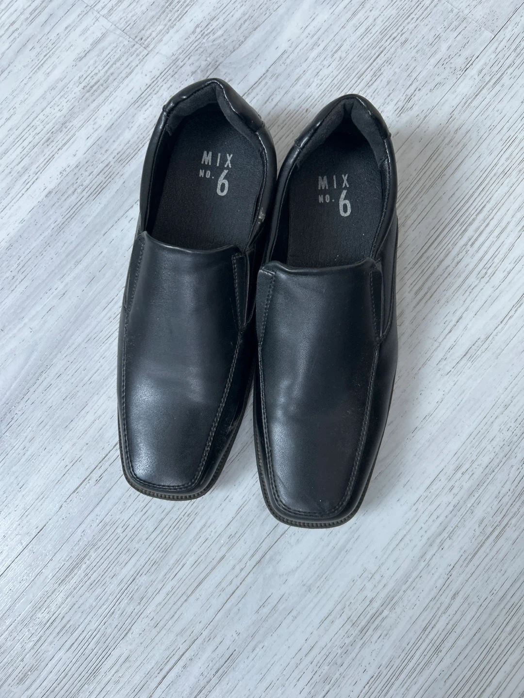 Black slip-on loafer shoes from Mix No. 6. These shoes are made with a synthetic material. They're suitable for dressy occasions. Great for school or parties!