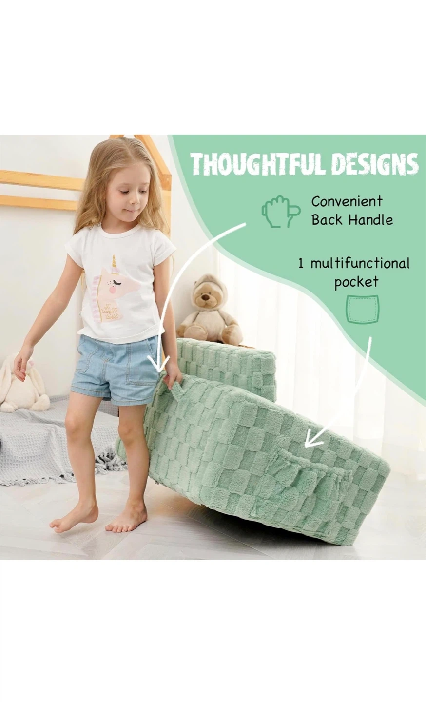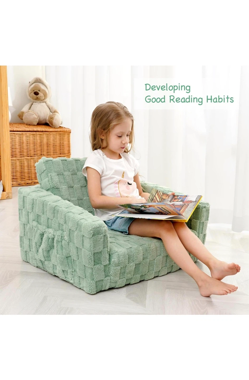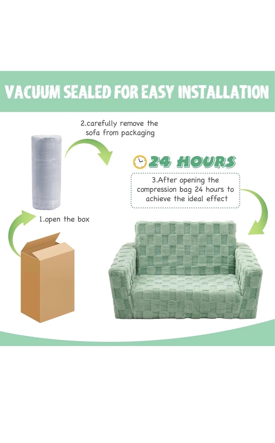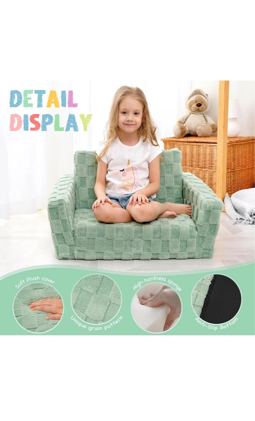 This kid's flip-out sofa easily transforms into a lounger for playtime or naptime! It features a soft plush cover with a unique grain pattern and a high-hardness sponge interior for comfort. The anti-slip bottom keeps it securely in place. This versatile piece is great for toddlers and young children.