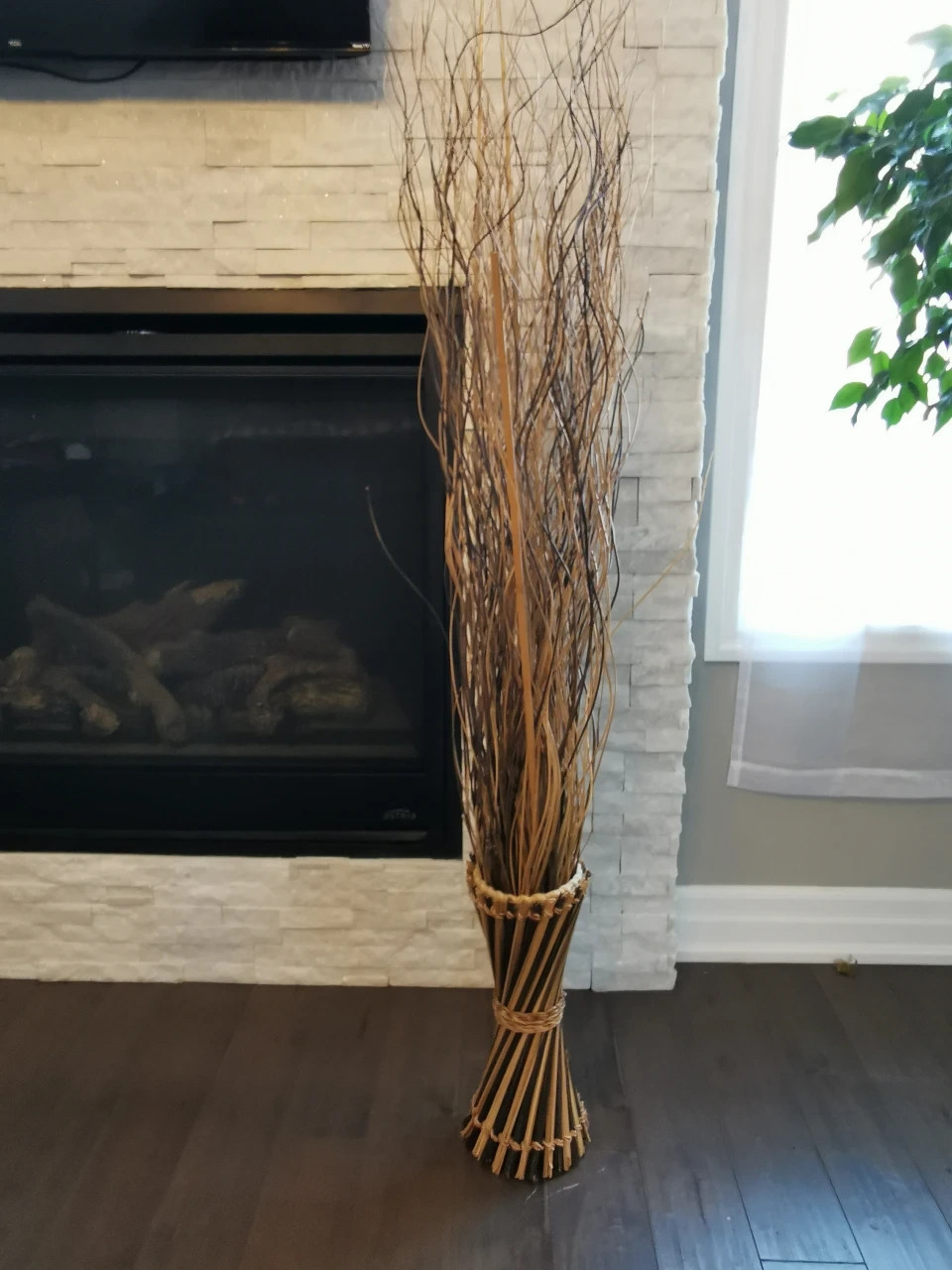 Adds a natural, rustic touch to any room. This bundle features dried branches secured in a woven basket base. It's perfect for enhancing your home decor. The branches are varied in thickness and natural tones.