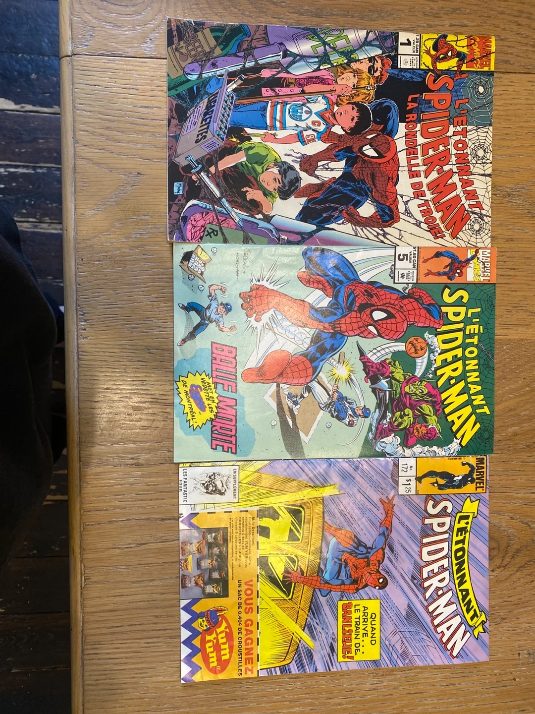Collection of three L'Étonnant Spider-Man comic books, including issues 1, 5, and 172. These are French editions. Issue 1 features "La Rondele de Trois!" and issue 5 has "Balle Morte". Issue 172 has "Quand Arrive... Le Train de Banlieue!".