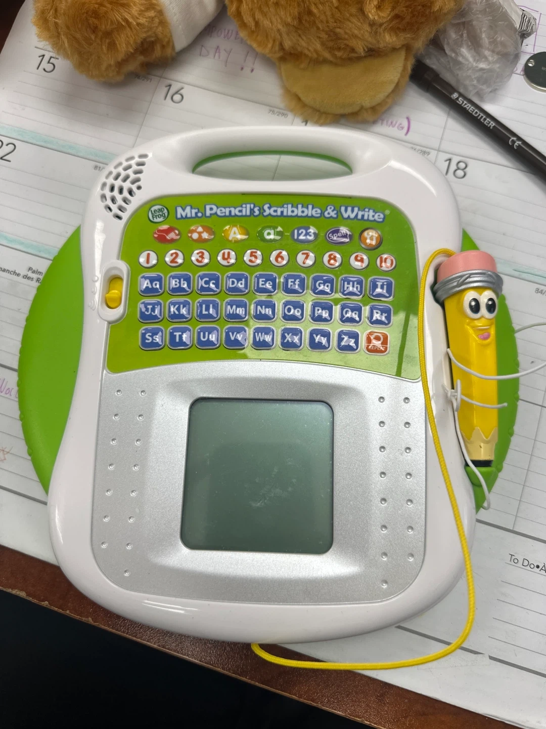 LeapFrog Mr. Pencil's Scribble & Write learning toy. Features ABCs, numbers, and drawing capabilities. Includes stylus attached by cord.