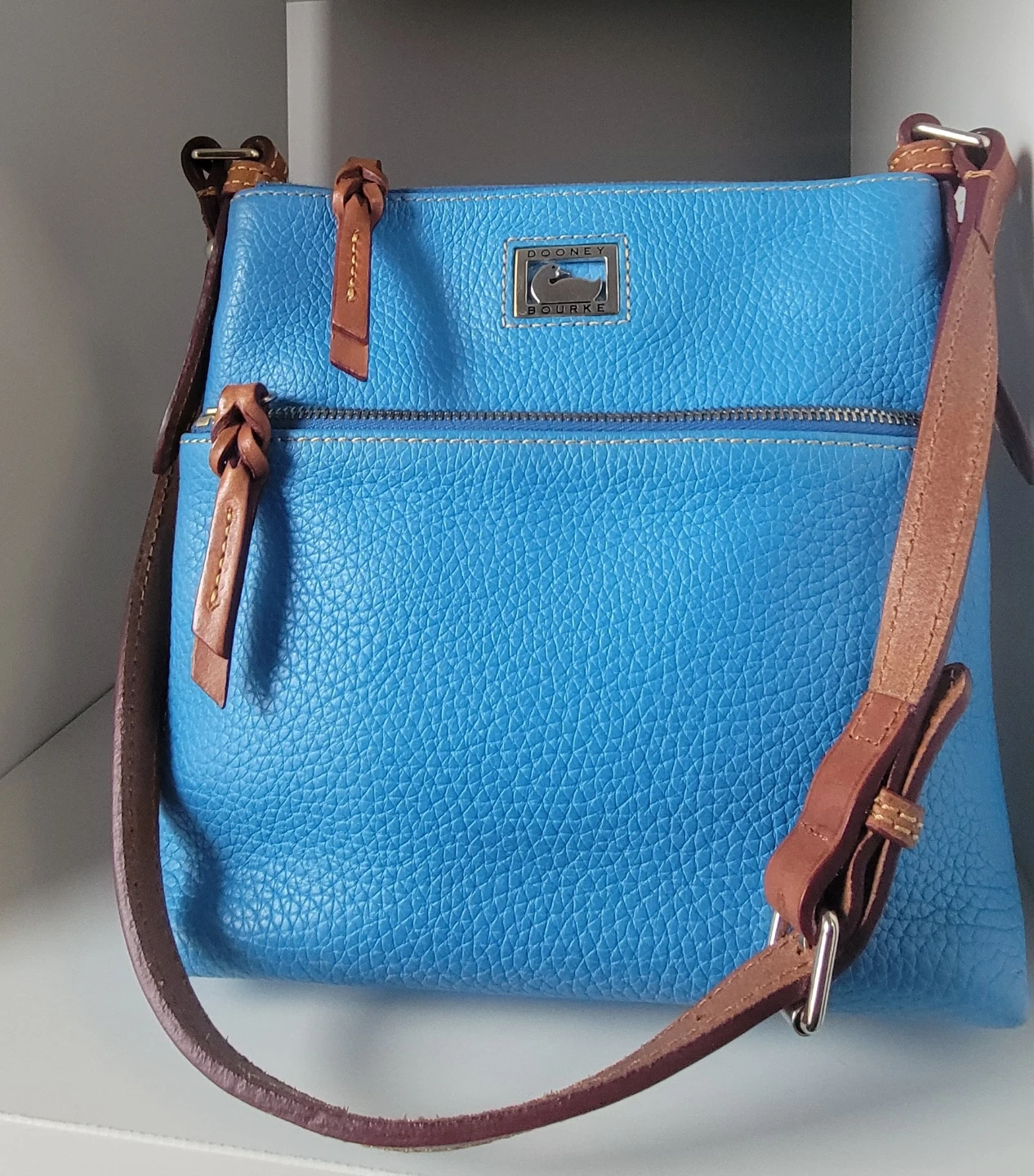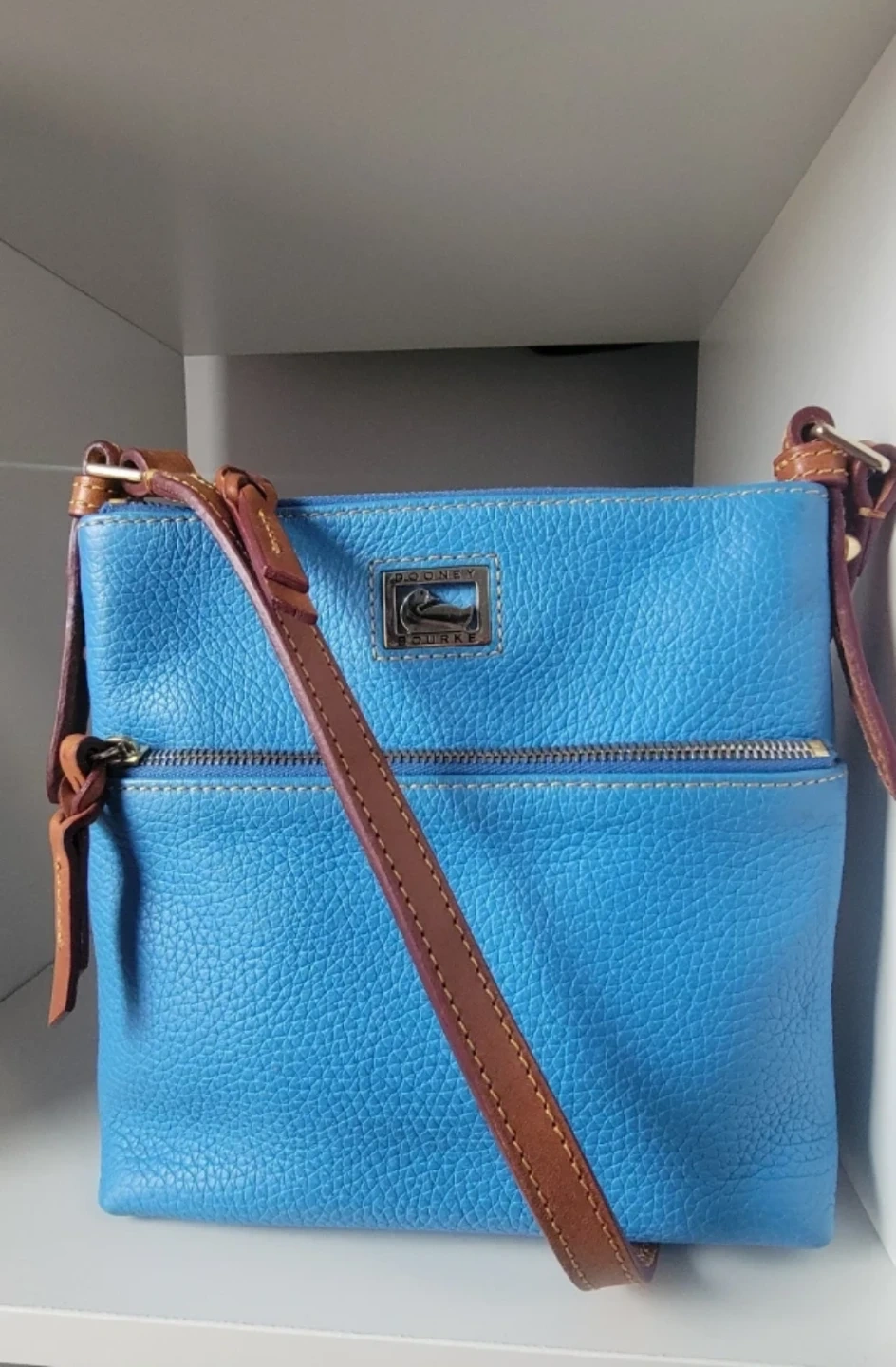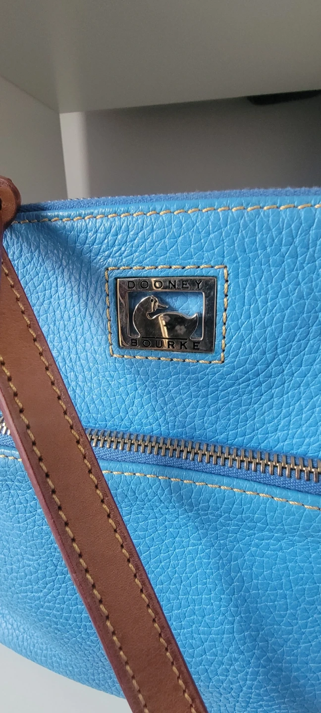 This is a blue pebbled leather shoulder bag from Dooney & Bourke. It has brown leather strap accents and silver-toned zippers. The bag has a main zippered compartment and a front zippered pocket.
