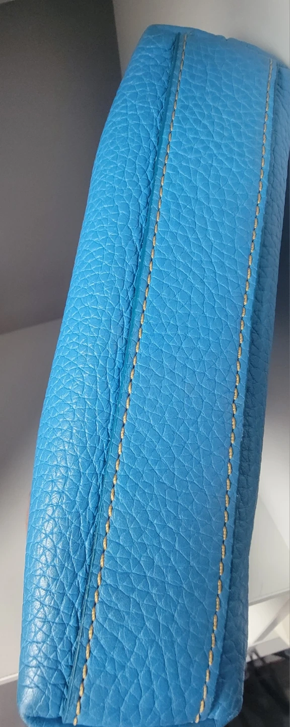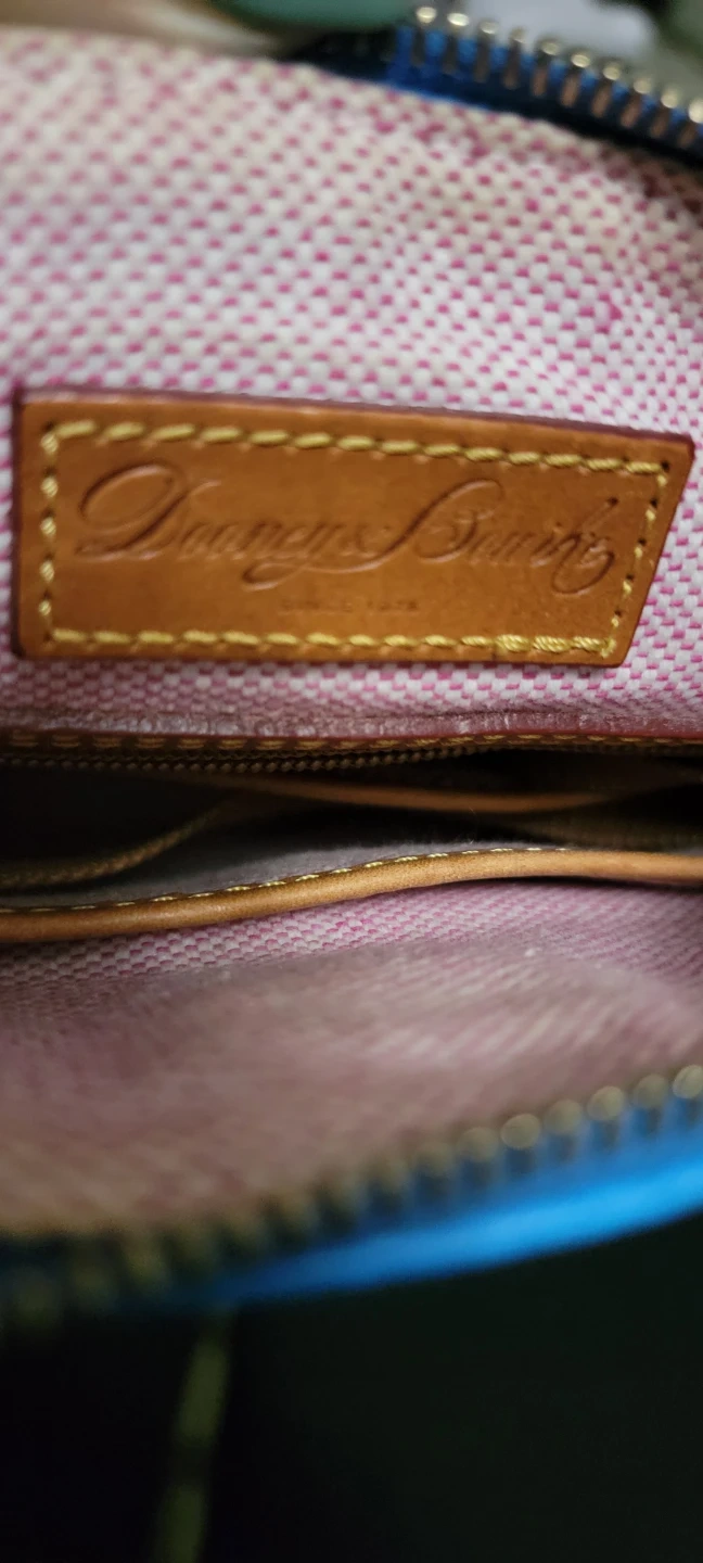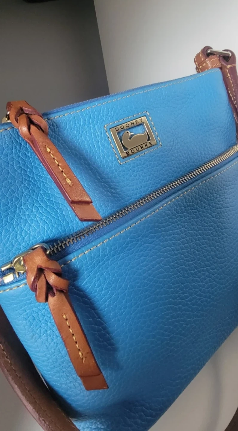 This is a blue pebbled leather shoulder bag from Dooney & Bourke. It has brown leather strap accents and silver-toned zippers. The bag has a main zippered compartment and a front zippered pocket.