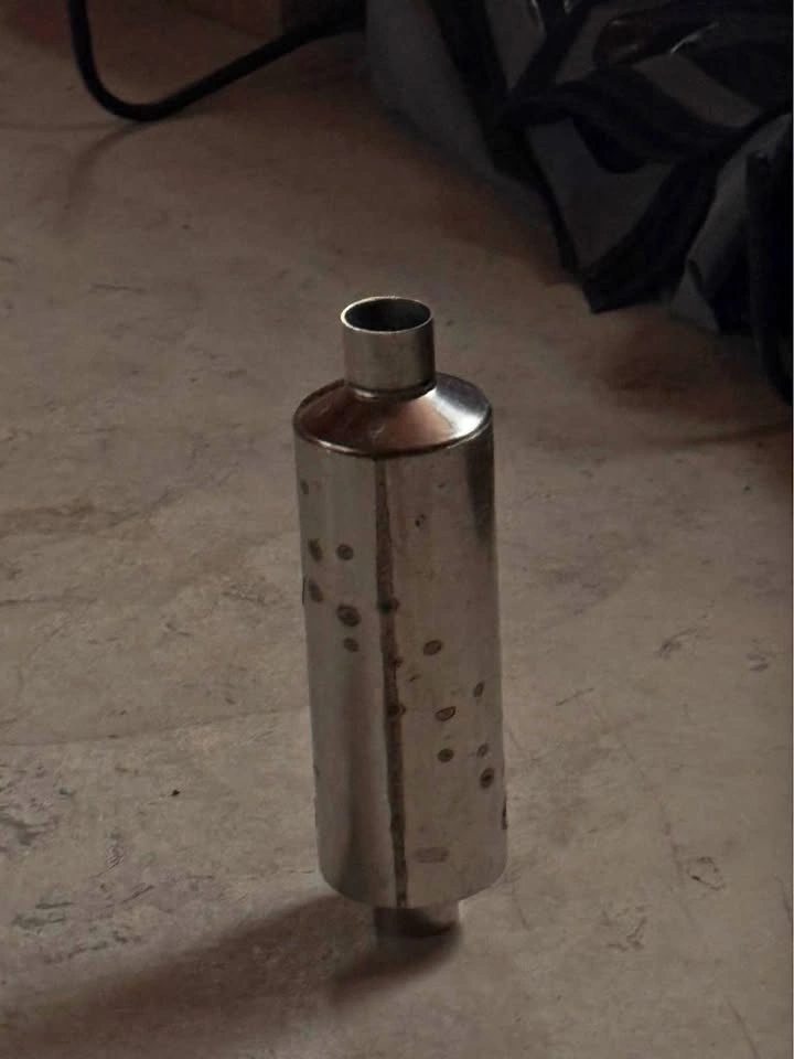 Universal stainless steel mini muffler / exhaust resonator in good condition. Solid metal construction, clean inside and out, no cracks or damage. Universal fit (custom/exhaust shop install recommended). Ideal as a resonator or sound modifier.