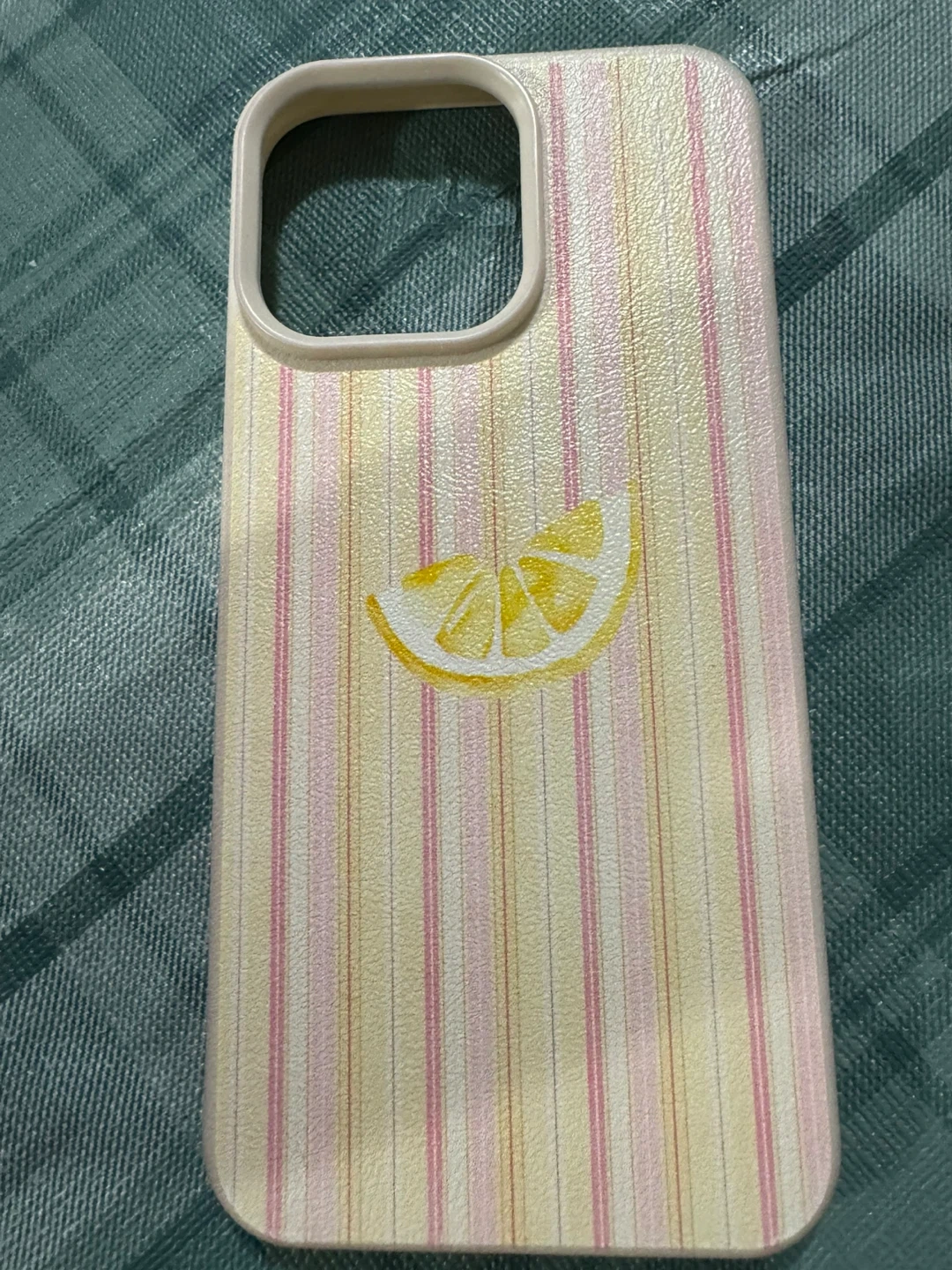 This is a protective phone case. It features a pastel striped pattern with a yellow lemon slice graphic. Fits a standard smartphone model. iphone 15 promax