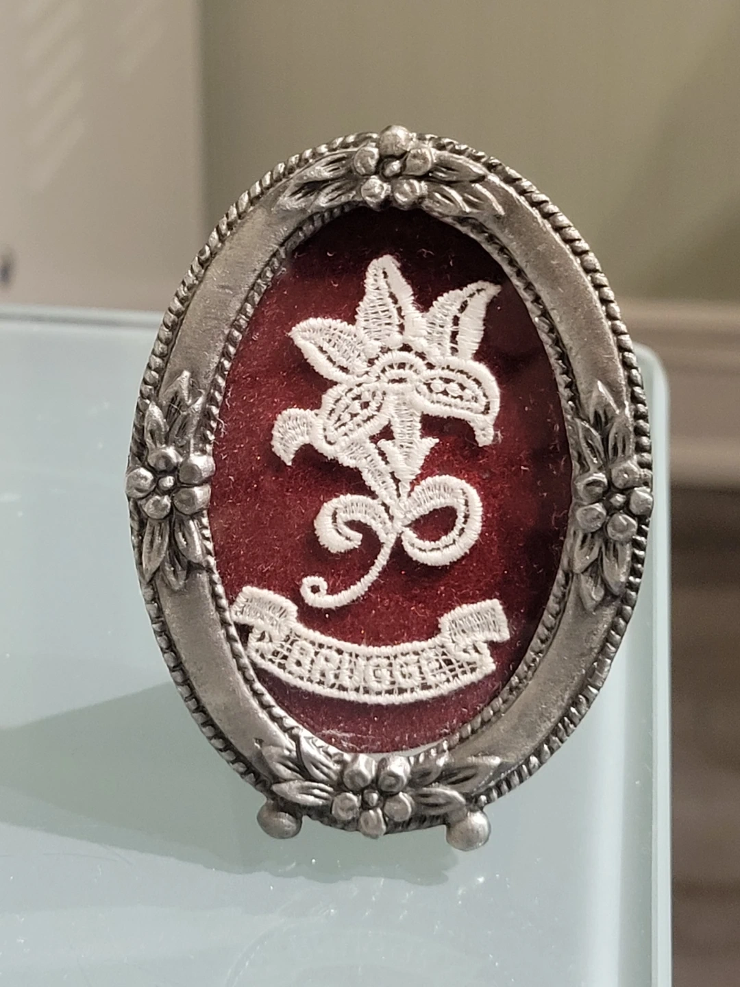 Adorn your space with this exquisite vintage Brugge lace floral picture frame, showcasing delicate craftsmanship. This unique piece features an ornate silver-tone oval frame with a burgundy velvet backing, highlighting a beautifully detailed white lace floral design. It's a charming addition to any collection, bringing a touch of old-world elegance to your home. Please note that this is a used item.