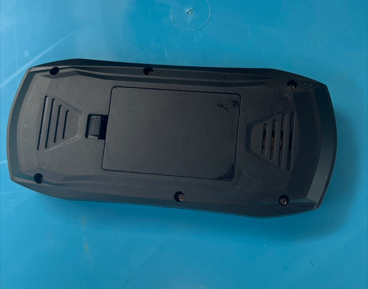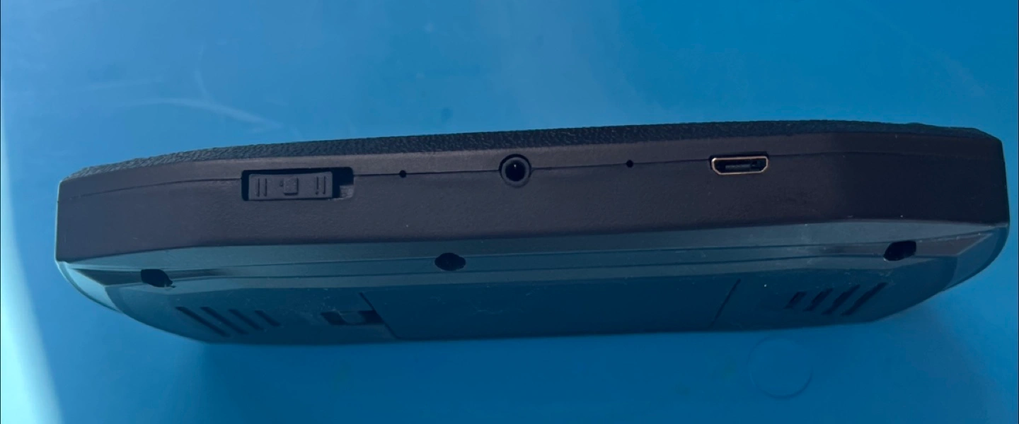 A portable gaming device in black. Features a screen and multiple buttons.