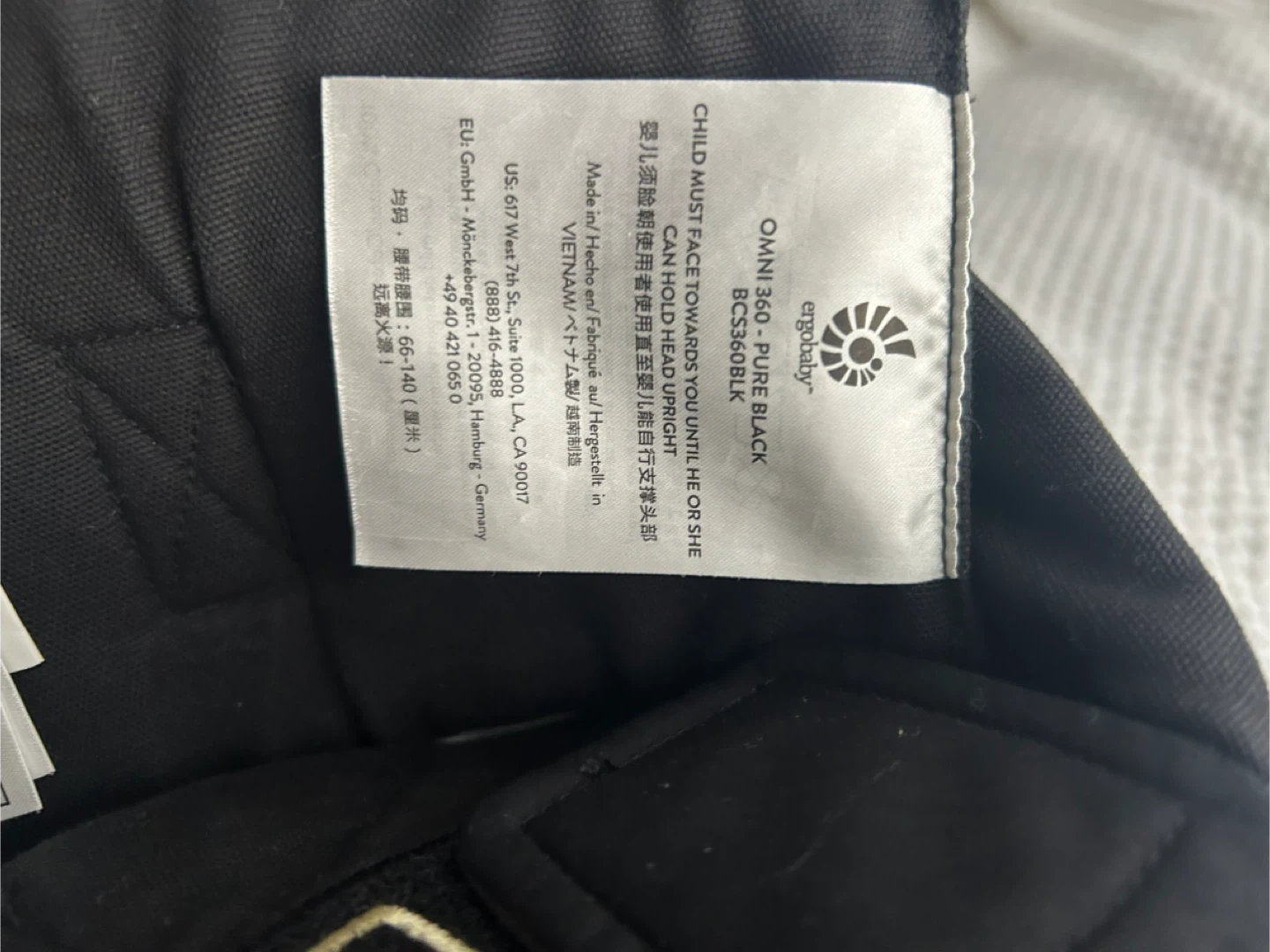 This is an Ergobaby Omni 360 baby carrier in pure black. It's designed for hands-free carrying. The carrier offers multiple carrying positions and can hold up to 45 lbs. Only used a few times