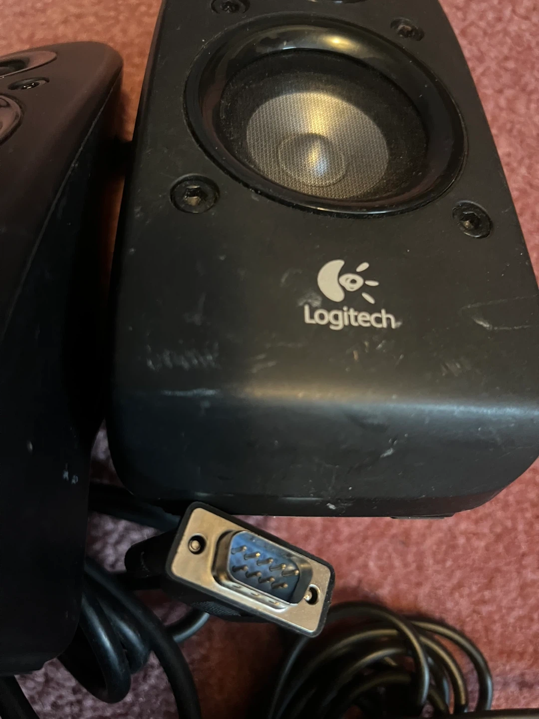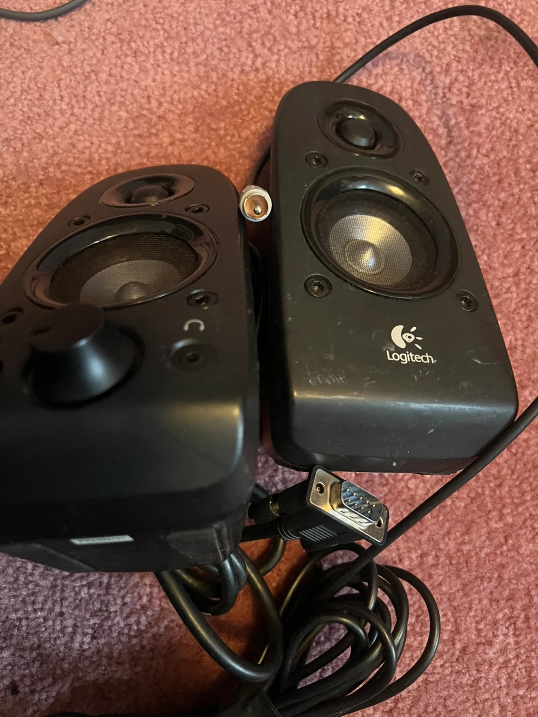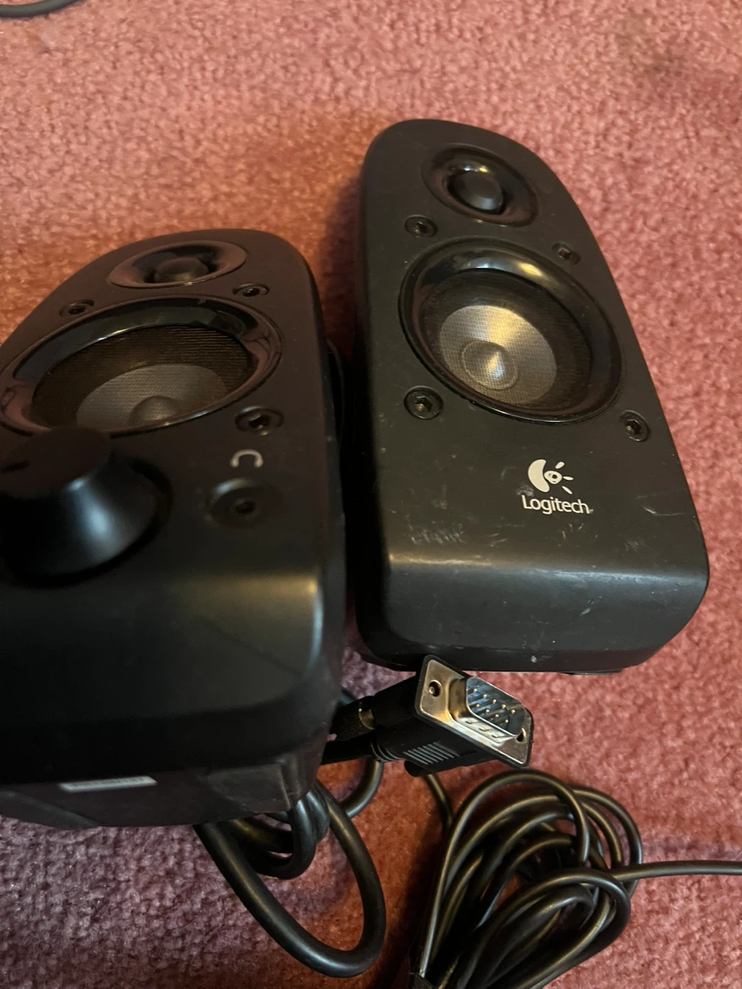 Compact black Logitech 2.0 PC speakers. These speakers are designed for desktop use and connect via a standard audio jack. They're great for upgrading your computer's sound! Black colour.