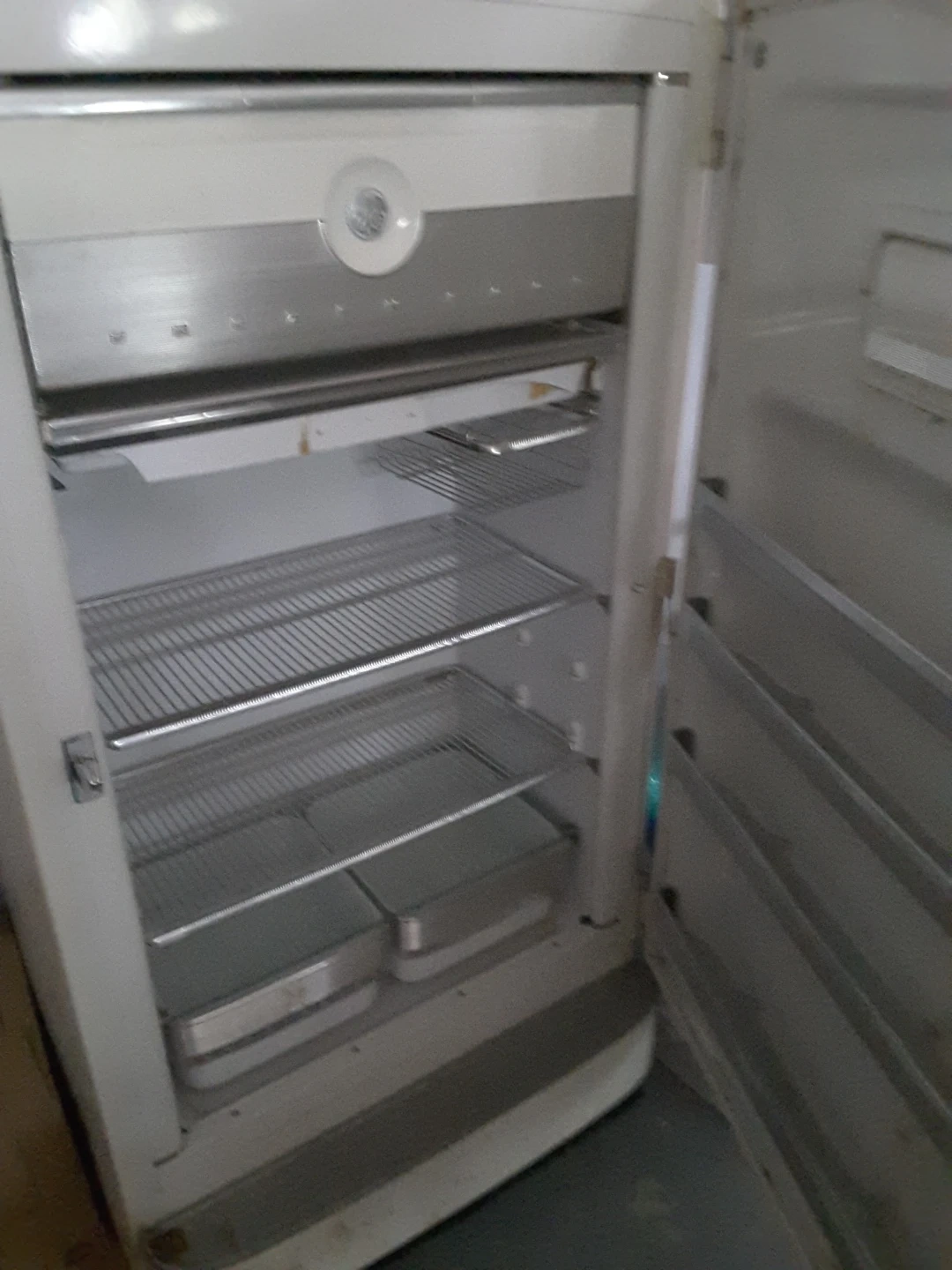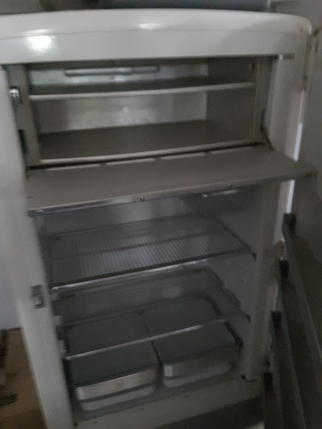This is a vintage white refrigerator with multiple shelves and crisper drawers. It has a classic design. Interior features include wire shelves and door shelves.
