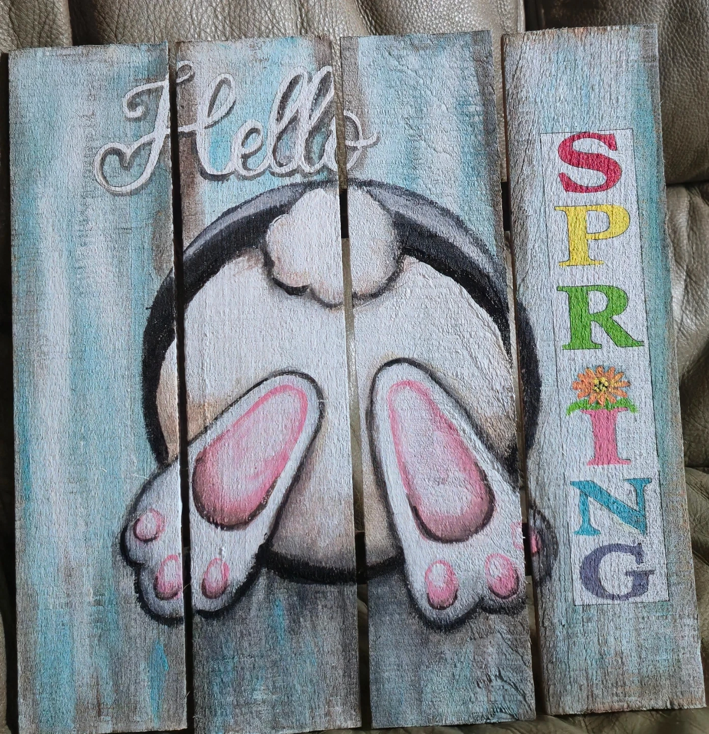 Cute hand-painted wooden signs perfect for Easter and spring decor. One sign features a bunny's tail and 'Hello SPRING,' while the other has a bunny face and 'happy EASTER.' Add a festive touch to your home! $20-40