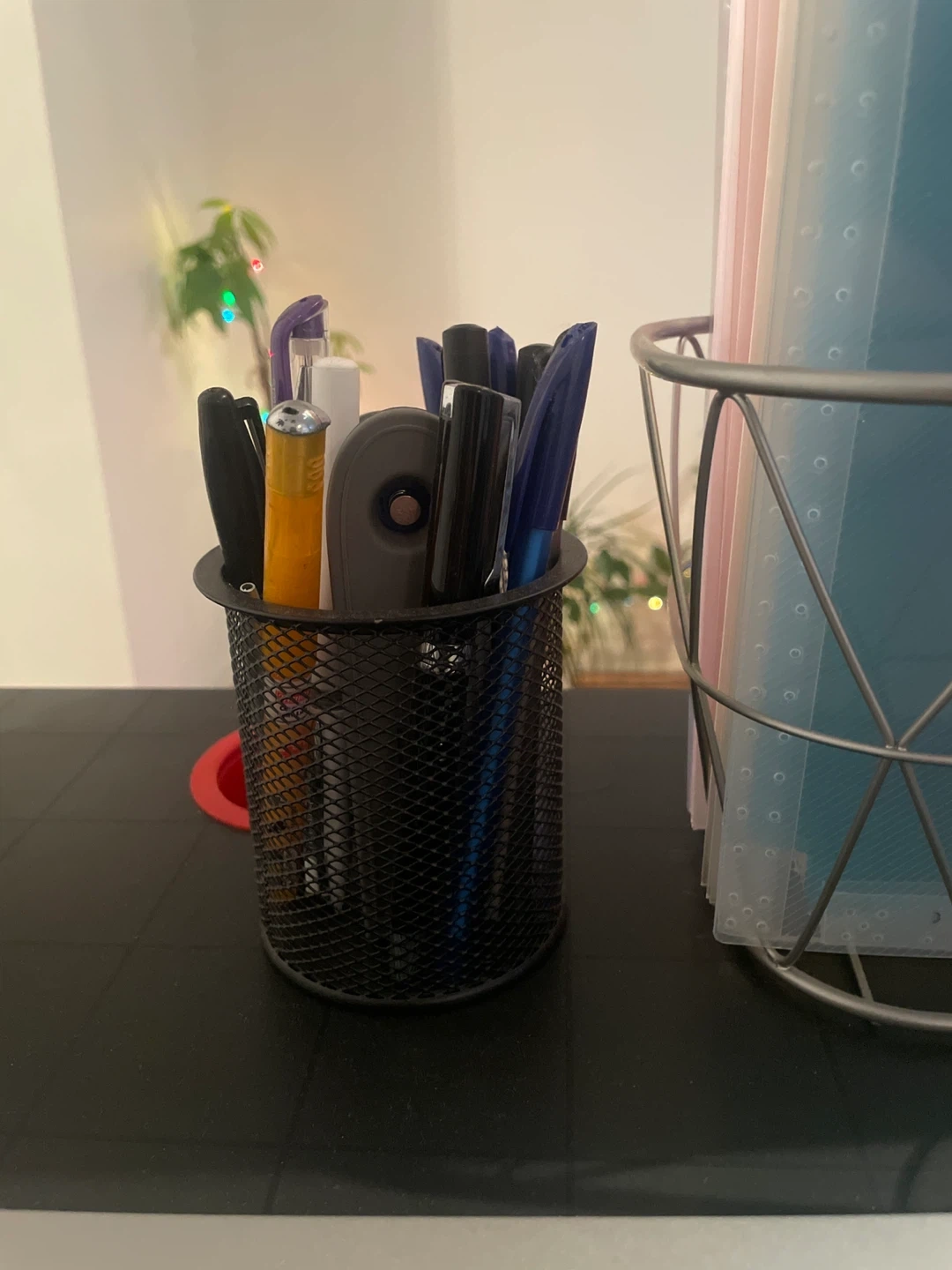 Selling a desk organizer set, including a black metal mesh pen holder and a metal basket filled with colourful file folders.