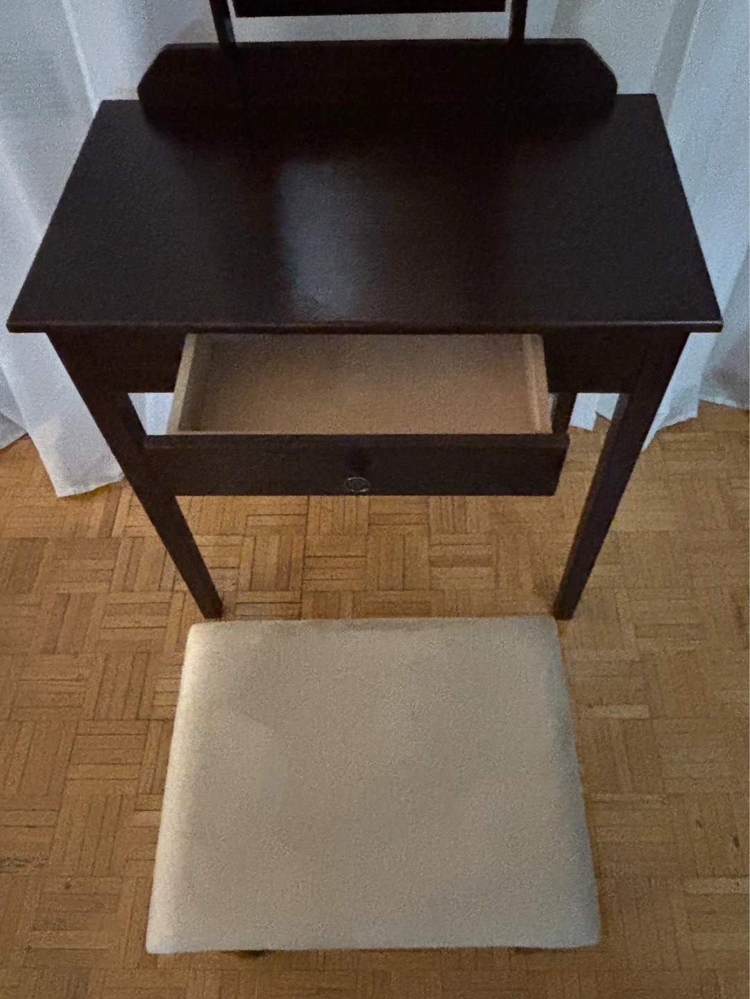 Dark wood vanity table comes with a matching stool and an adjustable mirror.