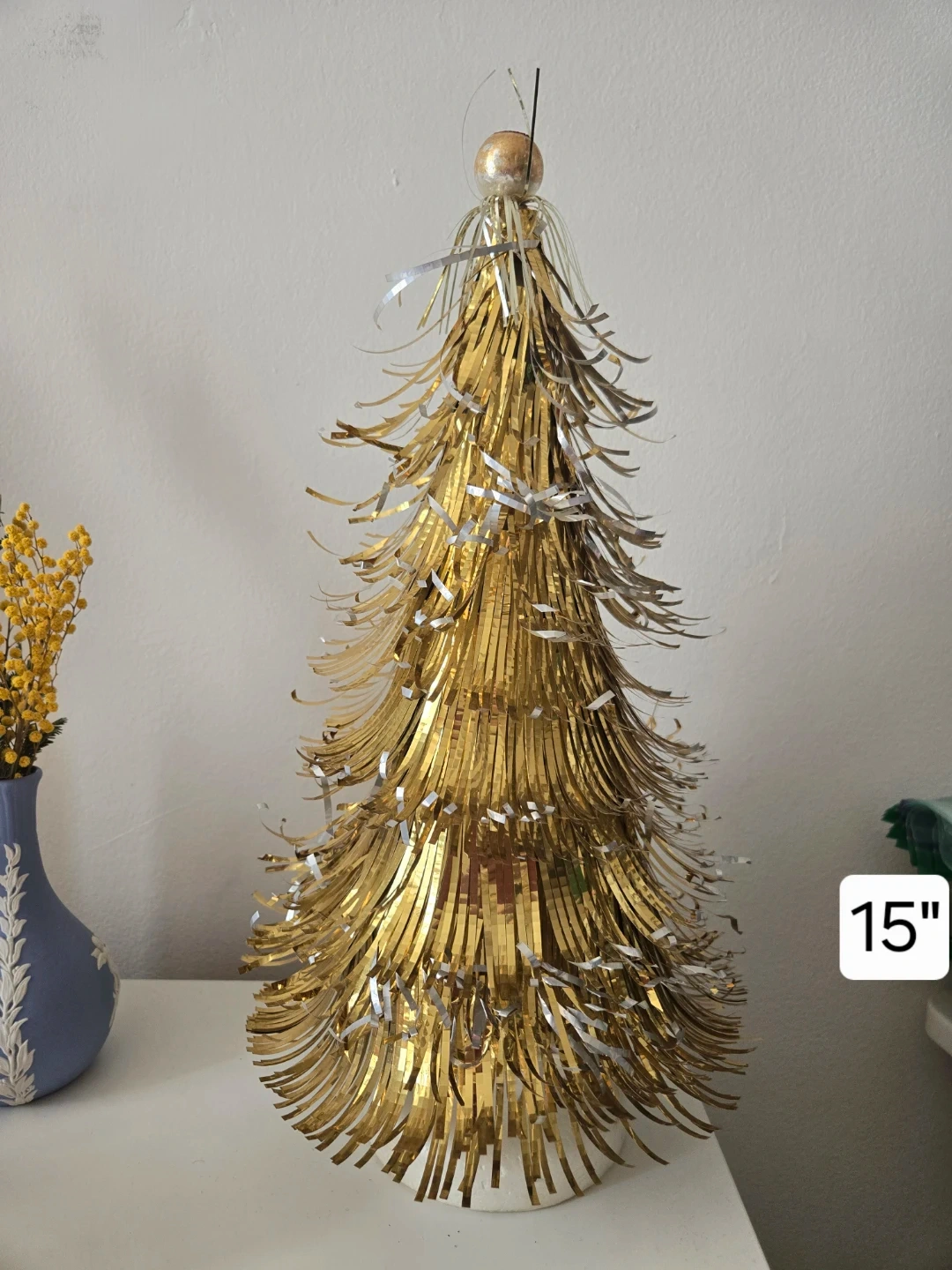 A festive 15" Christmas tree in gold . It's ready to add a bit of sparkle to your holiday decor! Perfect for small spaces or as a tabletop accent.