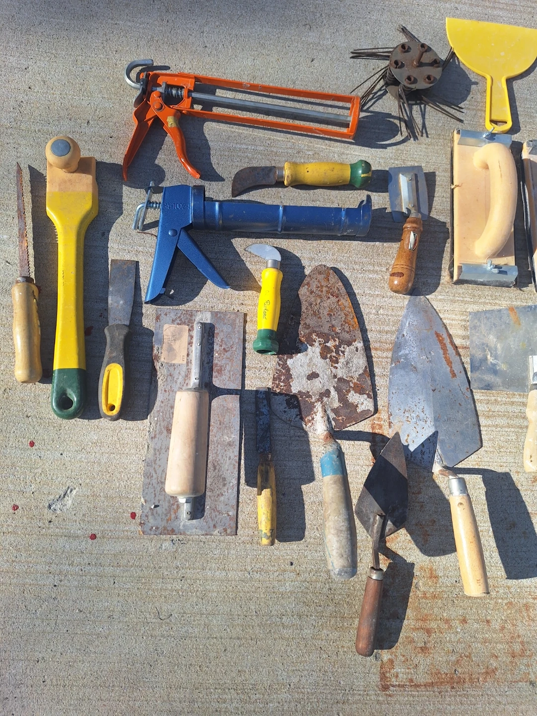 This lot includes a variety of hand tools for patching, scraping, and applying adhesives. You'll find multiple trowels, putty knives, and a caulking gun. These tools are designed for construction and renovation tasks. Painting, Drywall, Caulking.