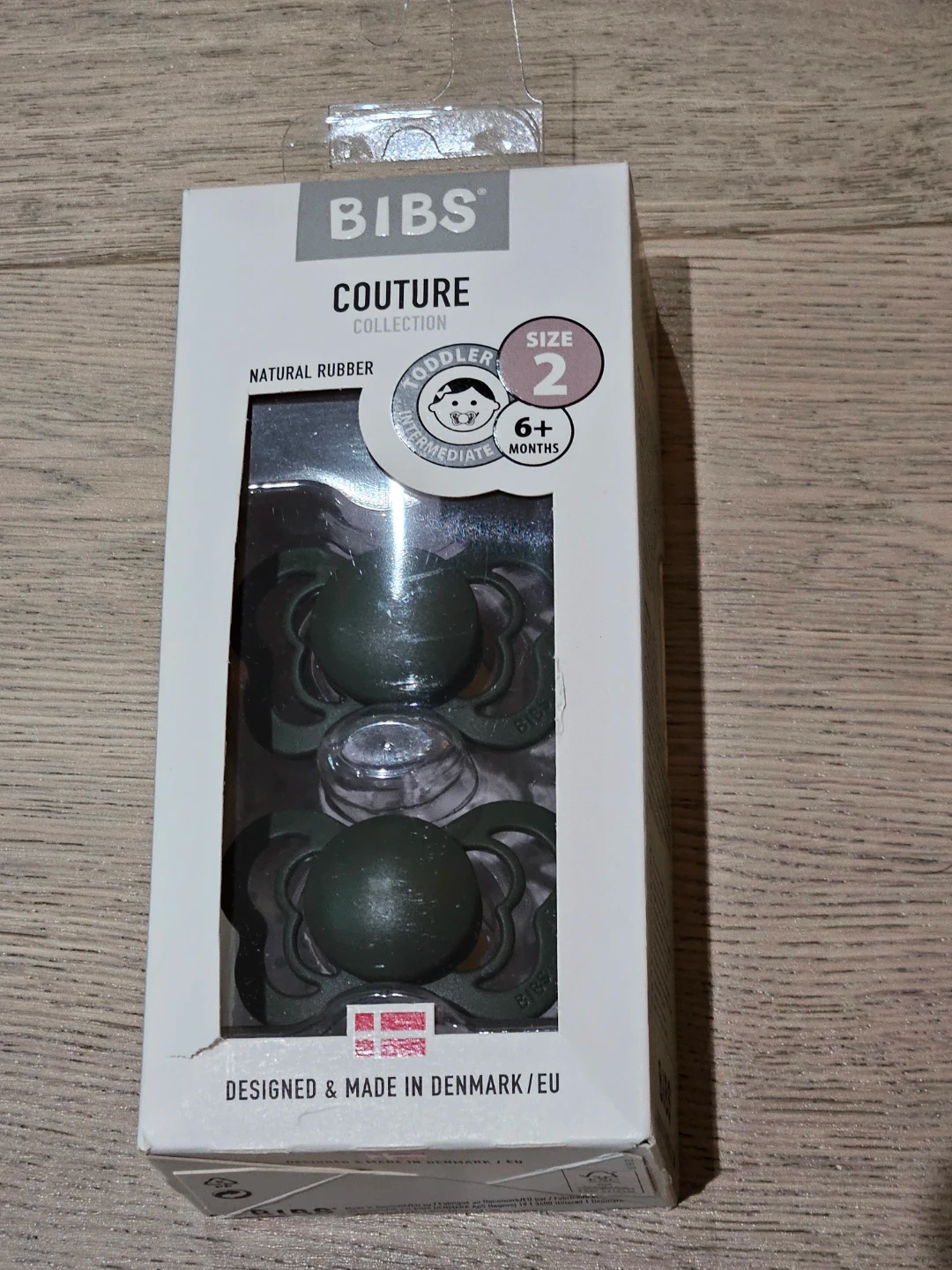 BIBS Couture Collection pacifiers, Size 2. Made from 100% BPA-free natural rubber. Anatomically shaped nipple for a comfortable fit. Designed and made in Denmark/EU.