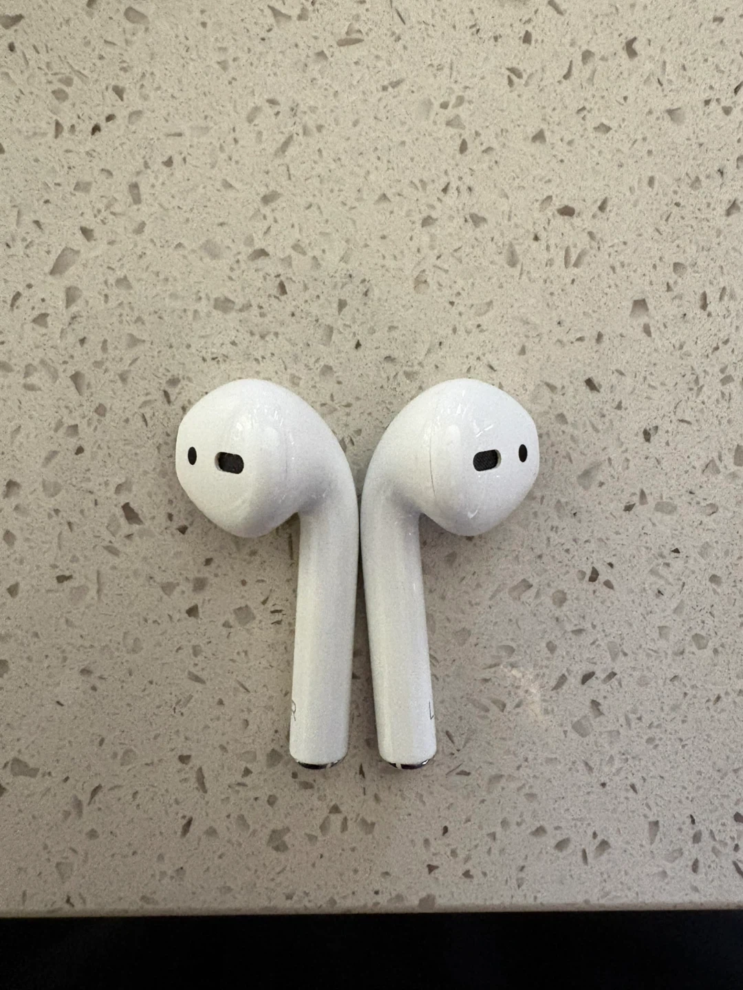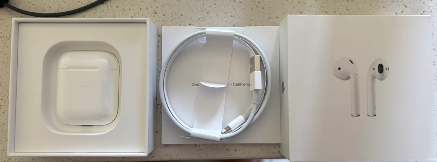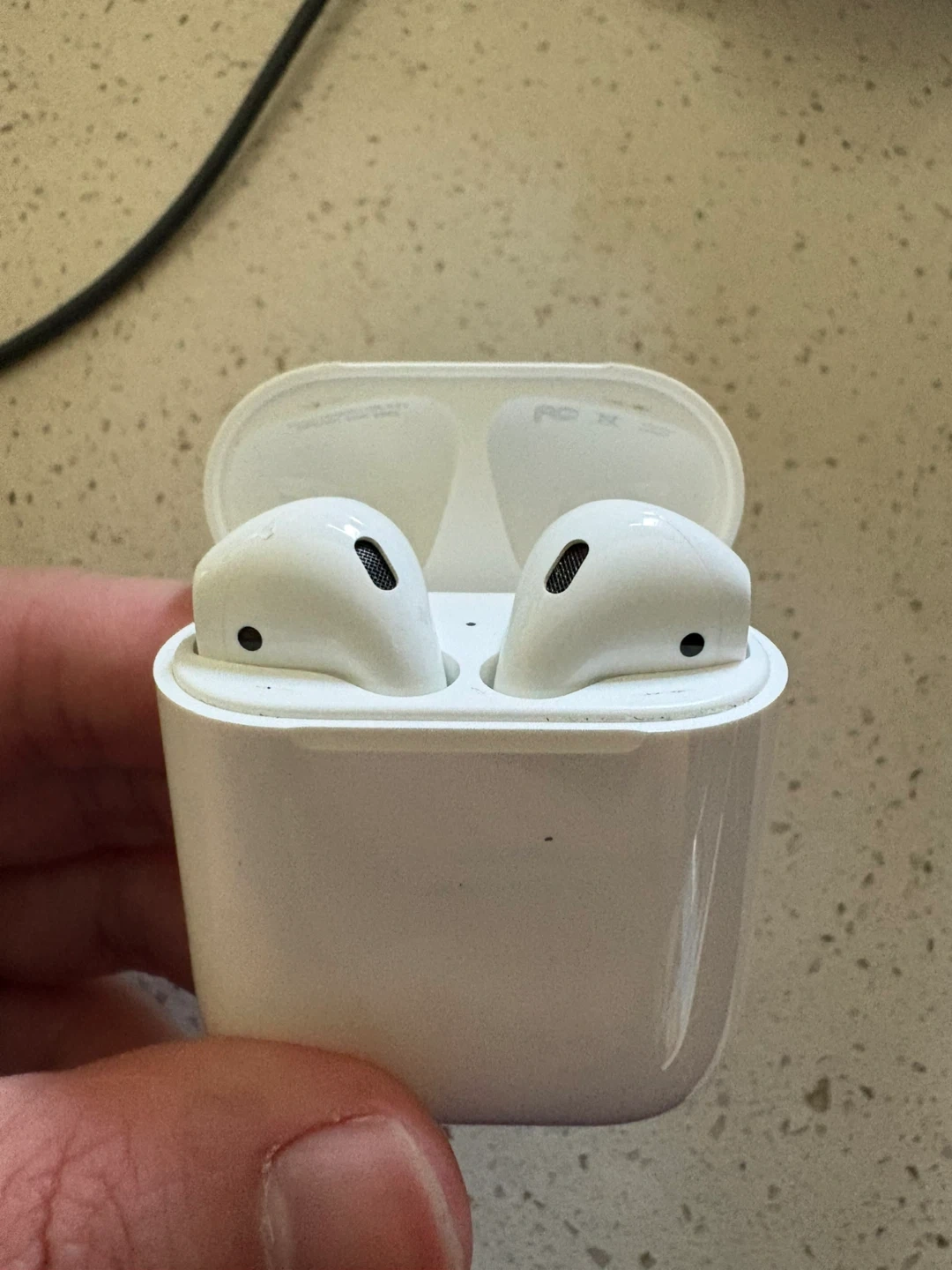 Apple AirPods (2nd generation) with charging case. Includes charging cable and original packaging. Has very little minor scratches and dirtiness, otherwise works perfectly.