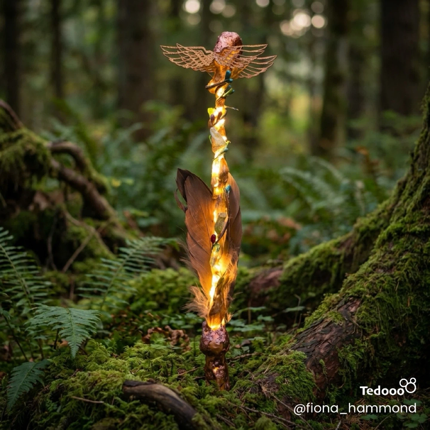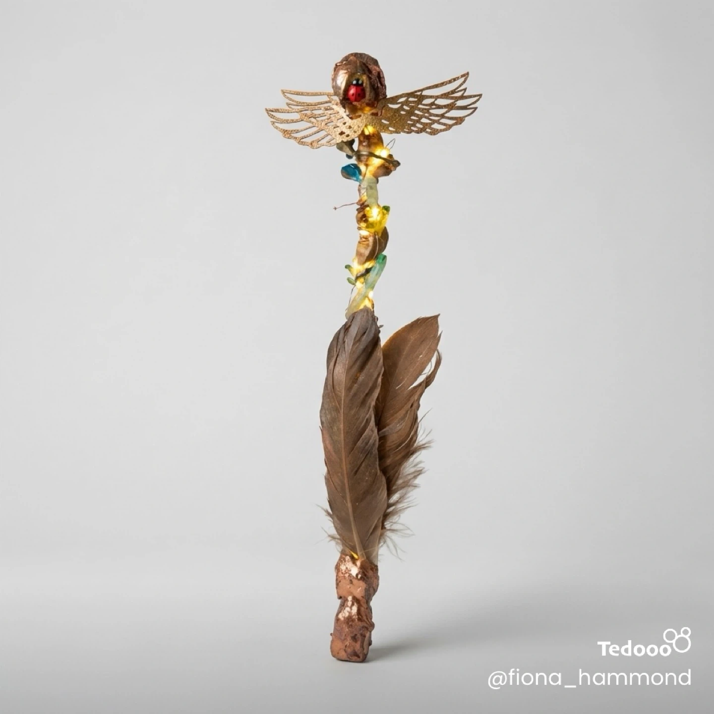 A unique decorative staff adorned with feathers and colourful crystals. It's embellished with gold accents and has a unique bird-like topper. This piece brings a touch of nature-inspired artistry. It also has a led light core.