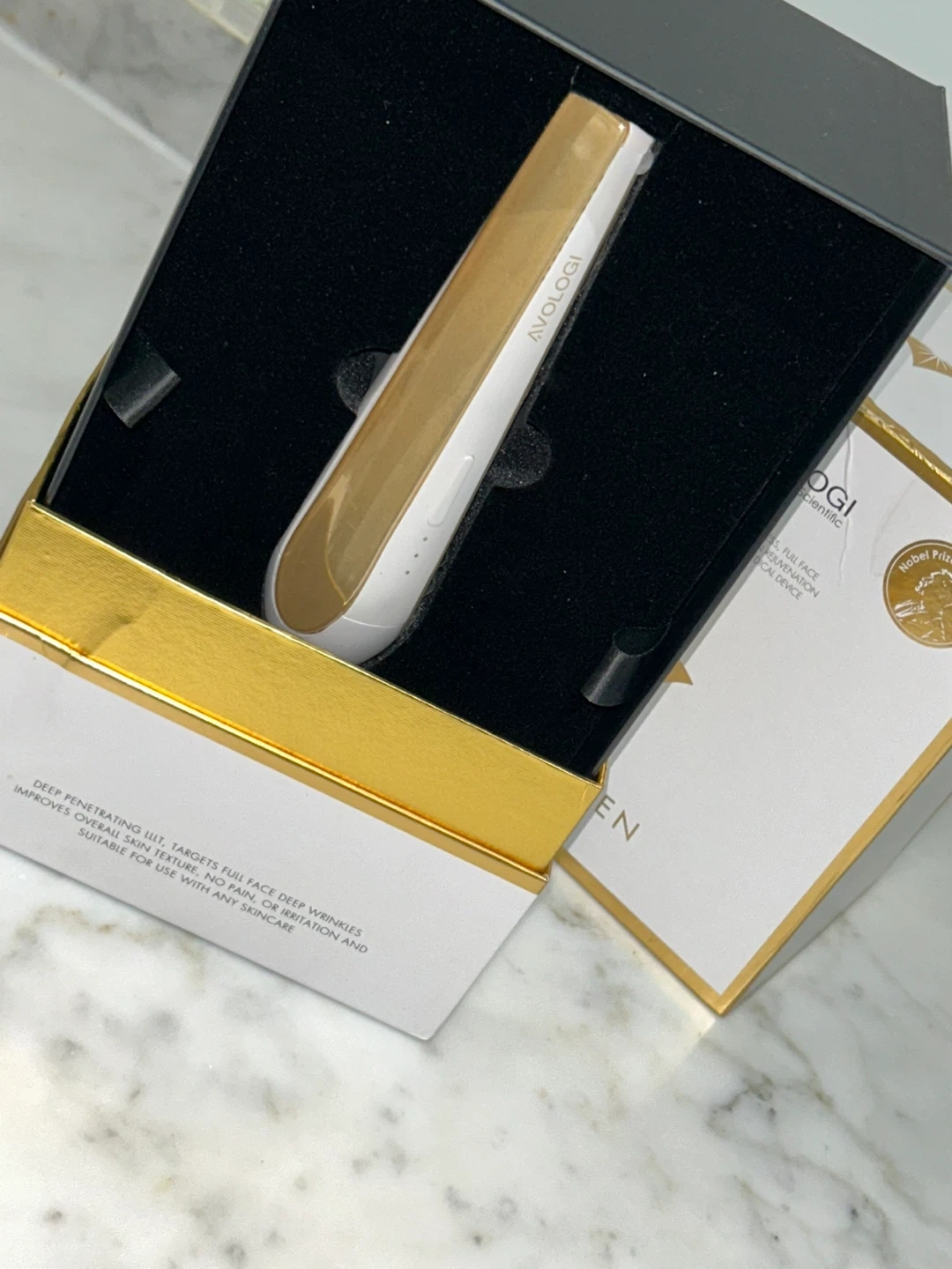 This AVOLOGI device is designed for non-invasive, full face deep wrinkle and skin rejuvenation. It features deep penetrating IUT to improve overall skin texture. It's a clinically tested medical device suitable for use with any skincare.