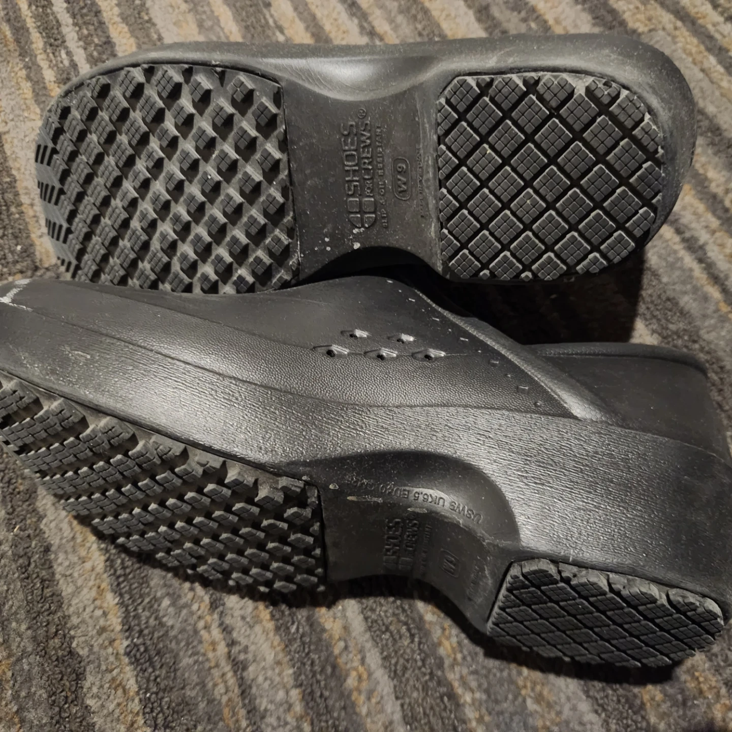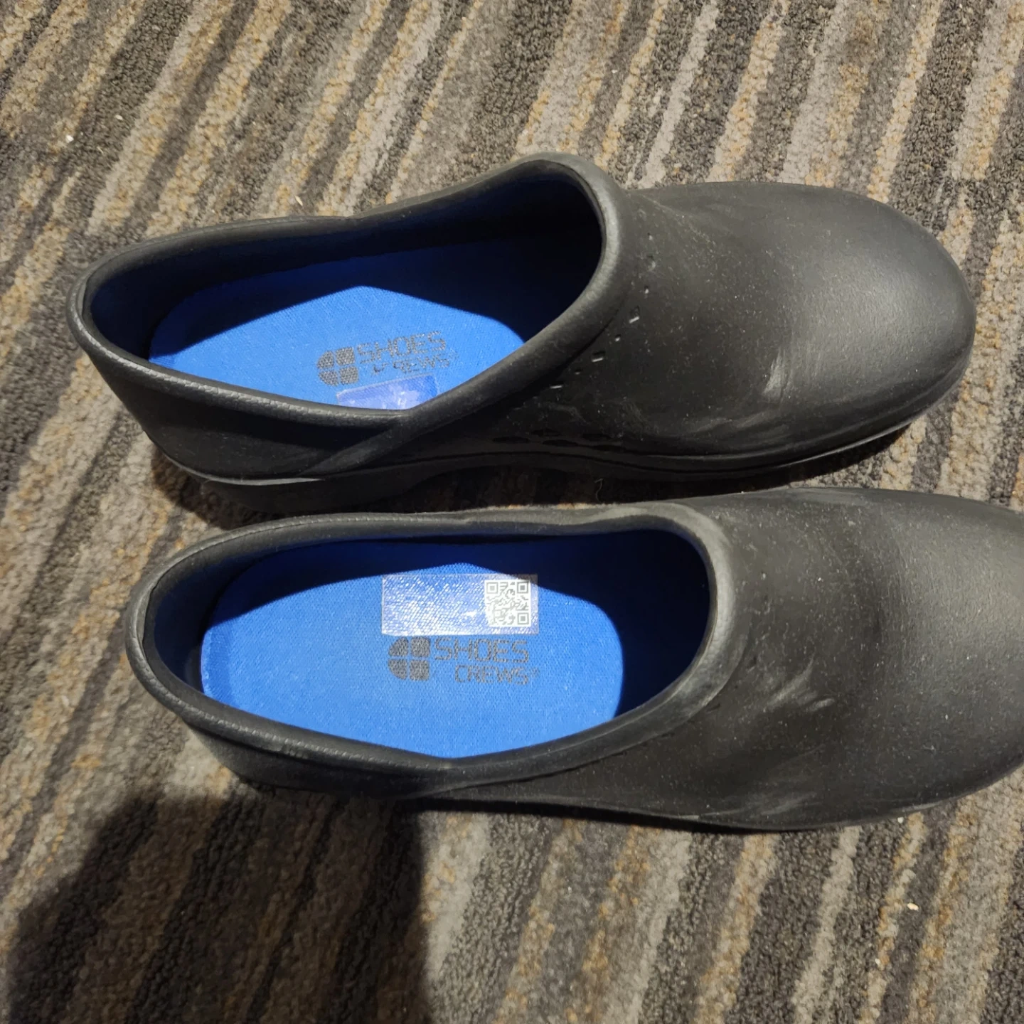 Black slip-on clogs from Shoes For Crews. These shoes come in size 9. I'm a 9.5 or a 10 and they fit well. They are (chefs shoes)for kitchens. They feature slip-resistant soles.