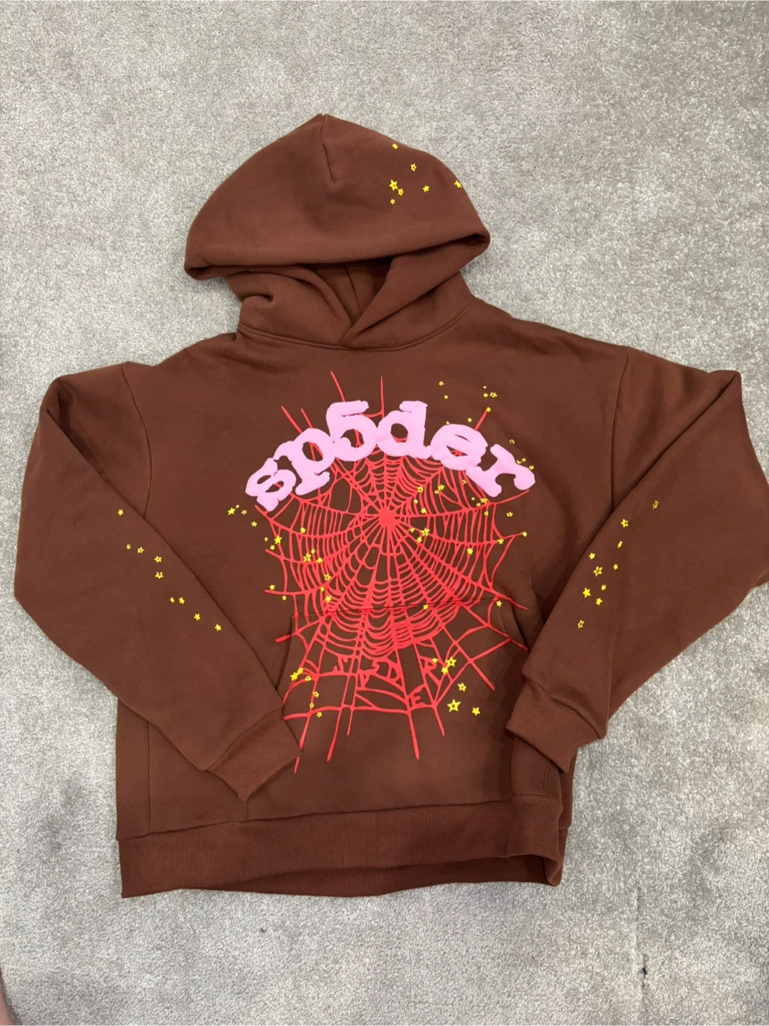 Brown hoodie with a pink Sp5der graphic and red spiderweb design. Made with 100% cotton. Machine wash cold, tumble dry low. Designed in USA.