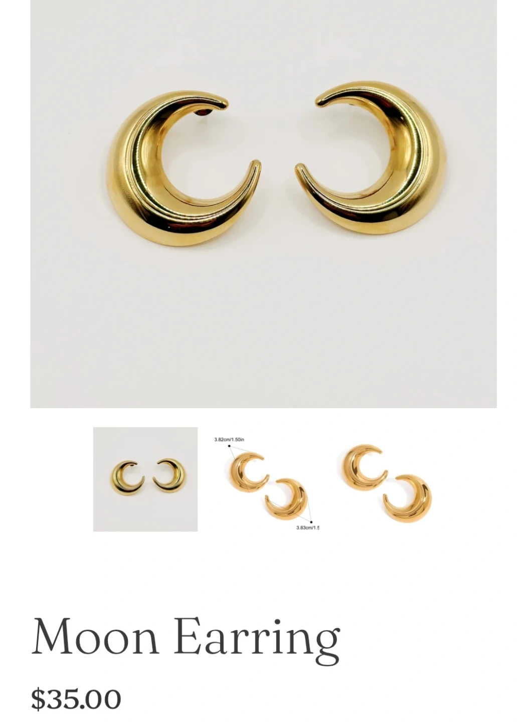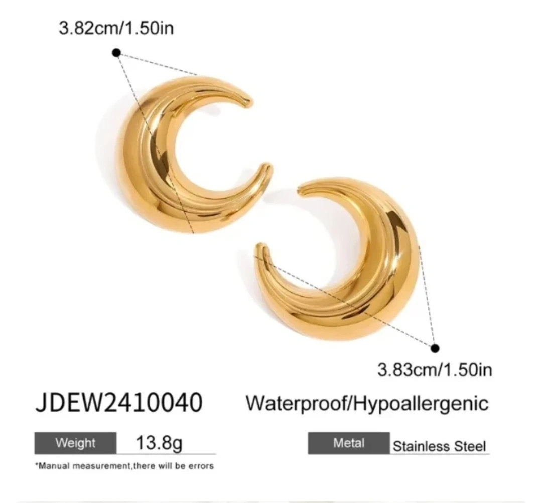 These are a pair of gold moon earrings made of stainless steel. They are waterproof and hypoallergenic. Each earring weighs 13.8g and measures approximately 1.5 inches.