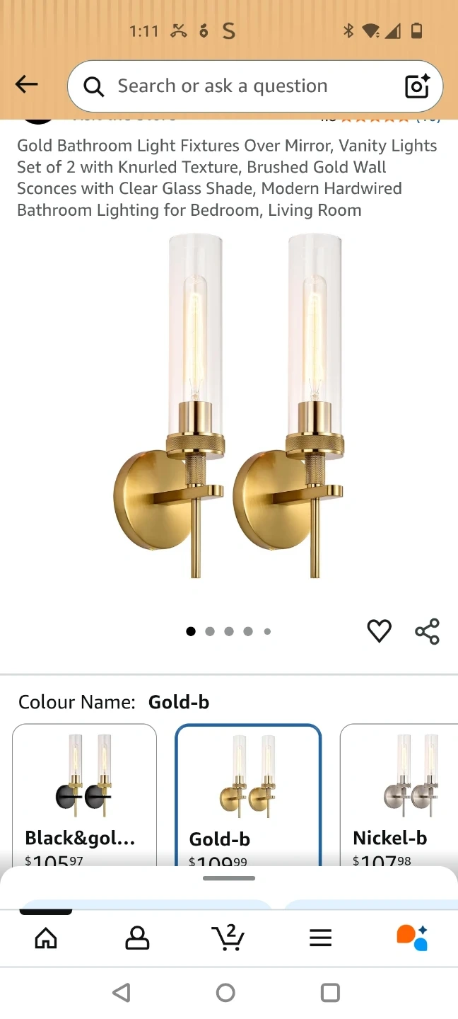 Selling a set of two gold bathroom light fixtures. They're designed to be installed over a mirror and feature a knurled texture and brushed gold wall sconces. The lights have clear glass shades and are hardwired for modern bathroom lighting in bedrooms or living rooms. Originally bought for $100.99