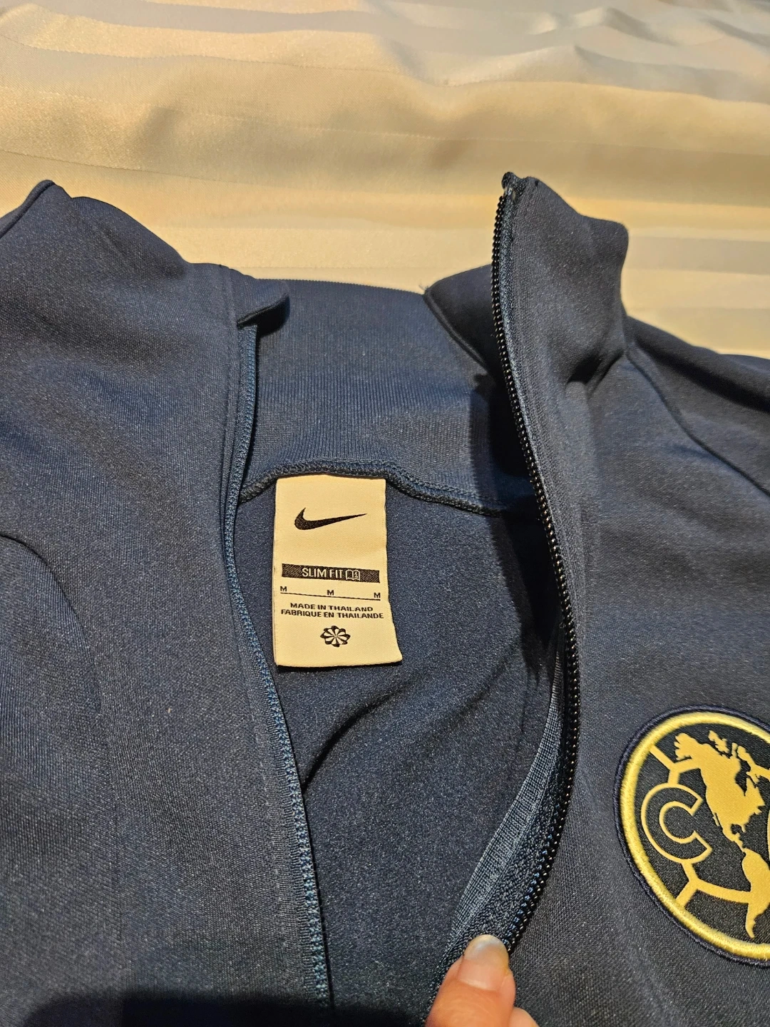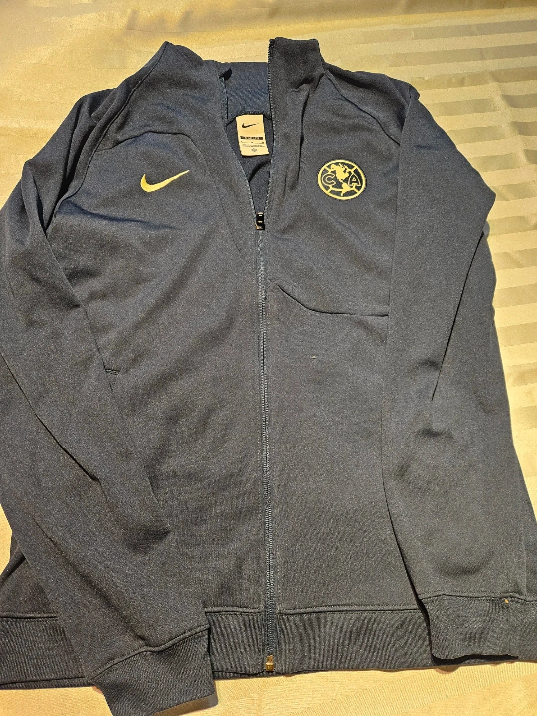 This is a navy blue Nike track jacket with the Club America logo on the chest. It's a size medium and made with a comfortable fabric. Zips up the front with a mock neck collar. It's a great jacket for any fan!